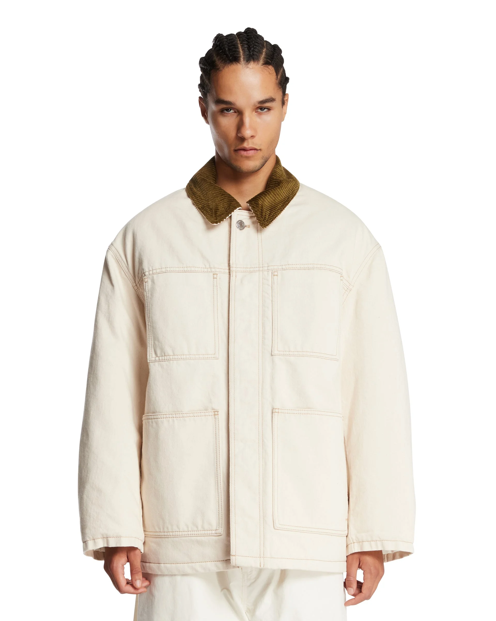 Ami Paris White Padded Worker Jacket. White cotton, classic contrast corduroy collar, long sleeves, concealed front fastening, four front pockets, branded label on the back, straight hem. Regular fit. Thiago is 185 cm and he is wearing size L. DETAILS Model: UJK834DE0106150 Composition: 100% Cotton; Padding: 50% Cotton, 50% Polyester Made in: TUNISIA Season: FW25-26