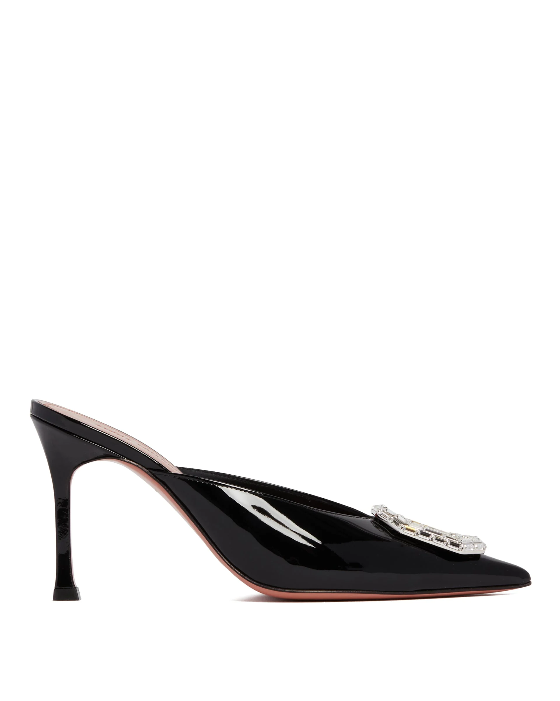 Amina Muaddi Black Camelia Mules. Black leather upper with a glossy finish, pointed toe and rectangular mirrored application. Leather sole and lining, high covered heel. Slip-on model. Heels Height: 9 cm DETAILS Model: 12S357010CAM Composition: 100% Leather; Details: 100% Glass Made in: ITALY Season: FW24-25