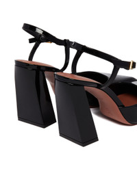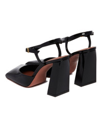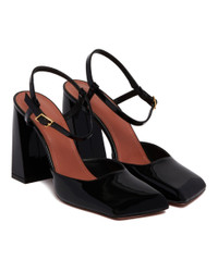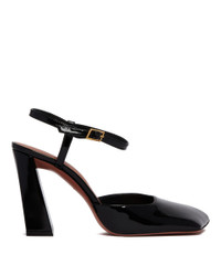 Amina Muaddi Black patent Charlotte Pumps. Black patent leather upper, squared oblique toeline, ankle strap with buckle fastening. Tonal block heels, leather sole and logoed insole. Heel Height: 9.5 cm DETAILS Model: C9S344424CHA Composition: 100% Leather; Detail: 100% Brass Made in: ITALY Season: FW24-25
