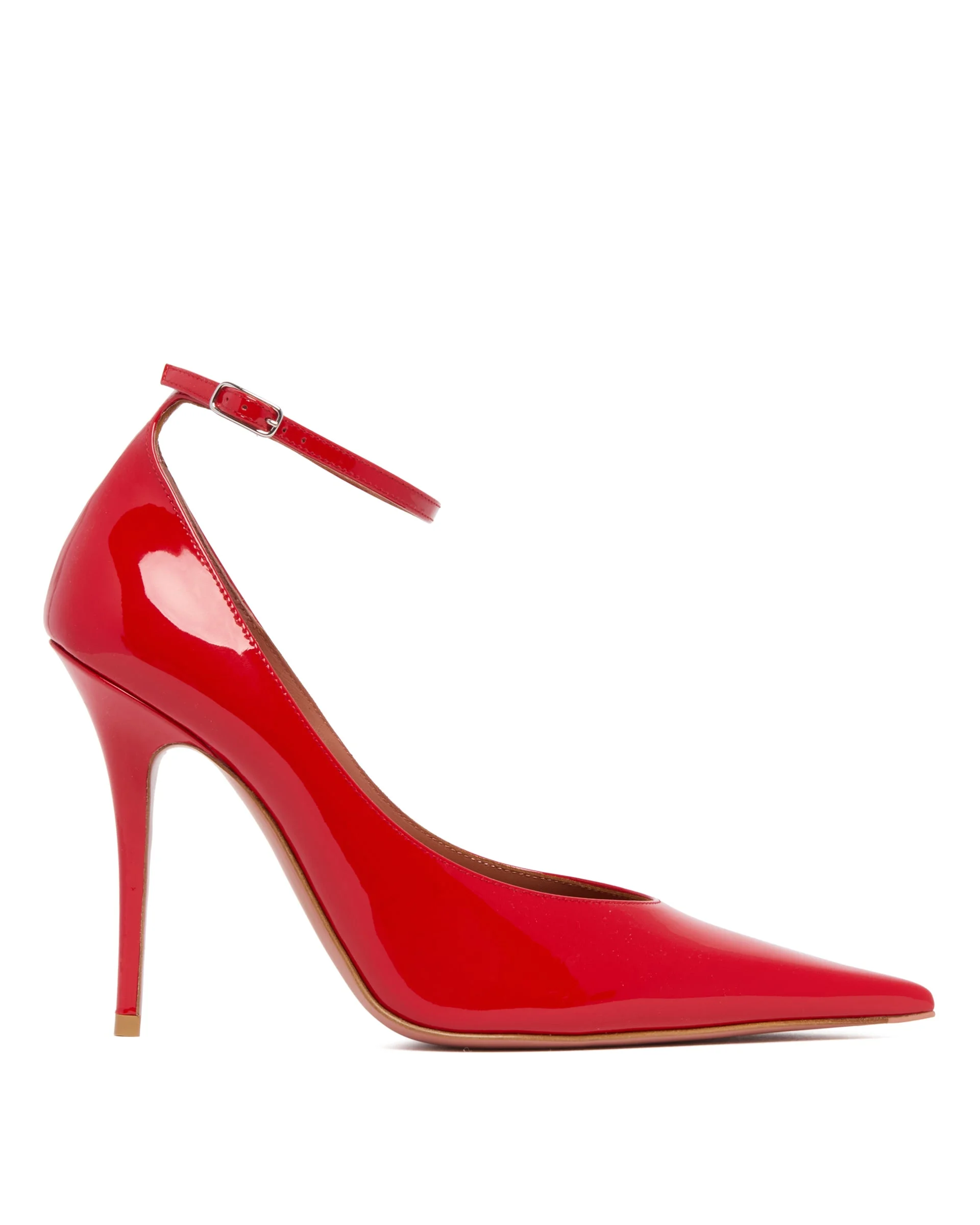 Amina Muaddi Red Anok Patent Leather Pumps. Red patent leather upper, ultra-pointed toe design, ankle strap with buckle, leather sole, leather lining, covered high heel. Heels Height: 10,5 cm DETAILS Model: 13S361047ANO Composition: 100% Leather Made in: ITALY Season: SS25