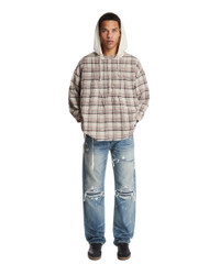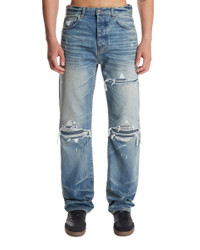 Amiri Blue Painter MX1 Jeans. Blue denim, paint splatter details, hand-made rips, regular waist, belt loops, pleated monochromatic patches. Five-pocket design, logo label on the back. Regular fit. Andrey is 188 cm and he is wearing size 31. DETAILS Model: AMDNGH1087HOI Composition: 100% Cotton Made in: USA Season: FW25-26