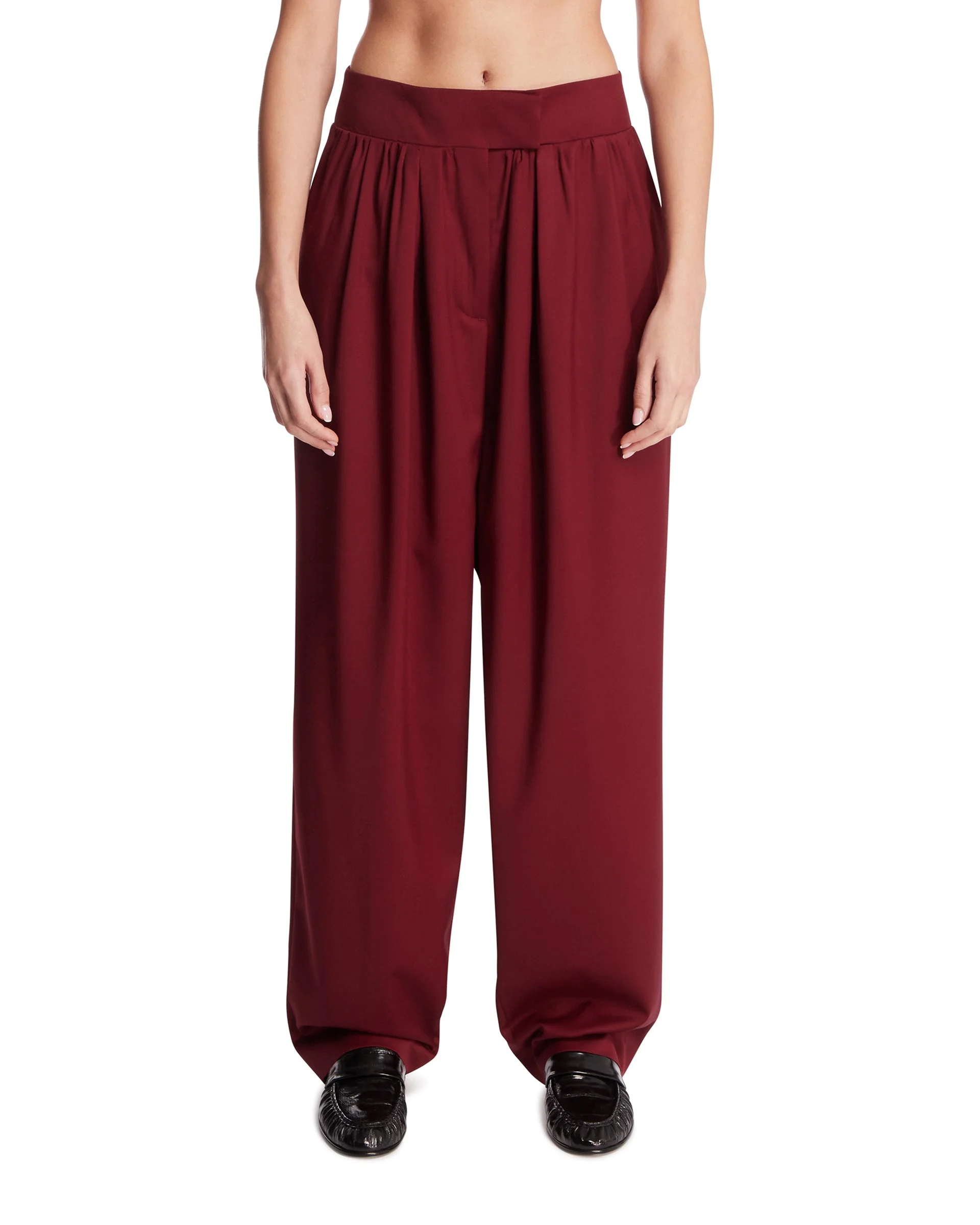 Armarium Marlon pant in burgundy virgin wool. Burgundy wool, high waist, concealed front fastening, pleats and gathering, loose fluid leg and side seam pockets. Anis is 178 cm and she is wearing size 40. DETAILS Model: ARMTMP037W027032 Composition: 100% Virgin Wool Made in: ITALY Season: FW25-26