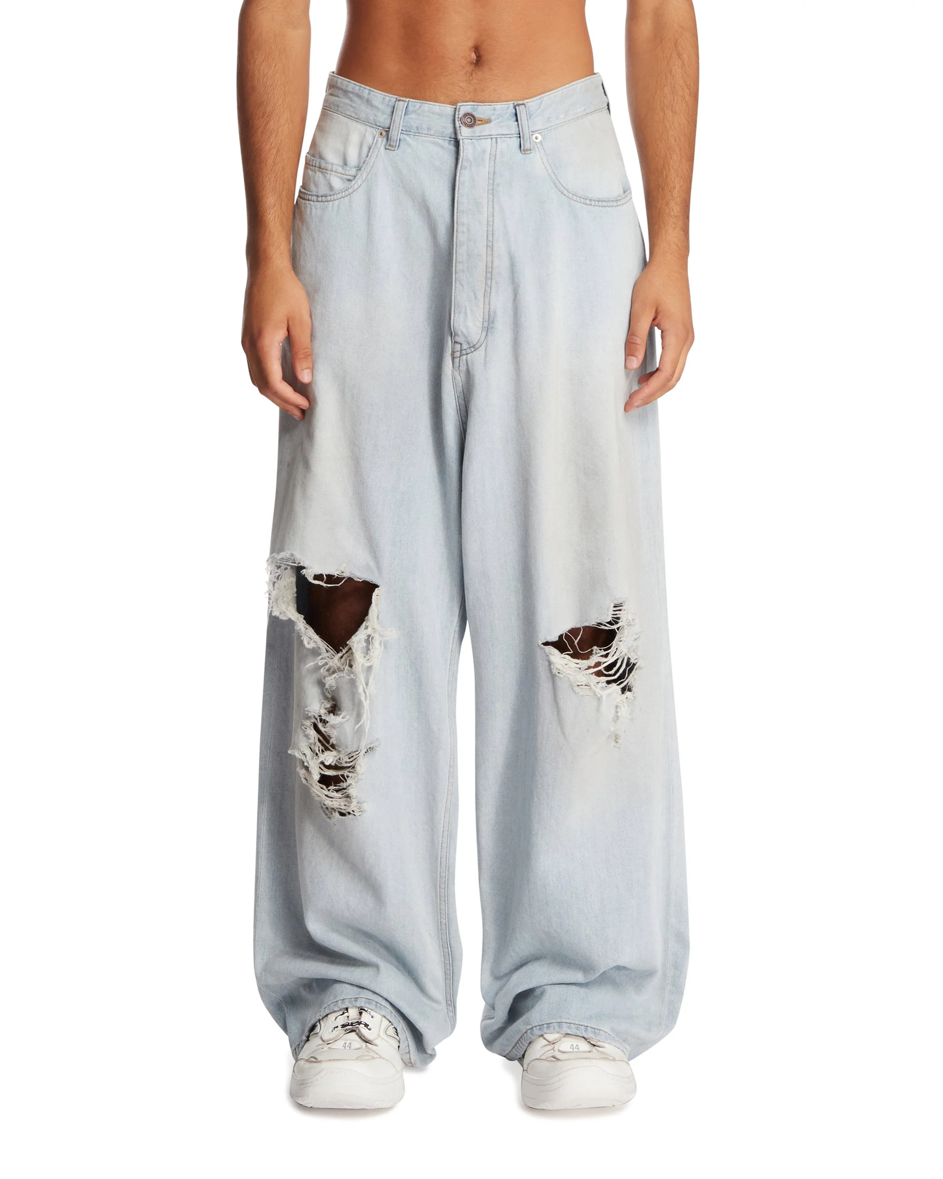 Balenciaga Blue Baggy Denim Jeans. Blue cotton denim, decorative rips, mid-rise waist, front button and zip closure. Wide leg, logo label on the back, baggy fit. Thiago is 185 cm and he is wearing size M. DETAILS Model: 849948TTWA34200 Composition: 100% Cotton Made in: JAPAN Season: FW25-26
