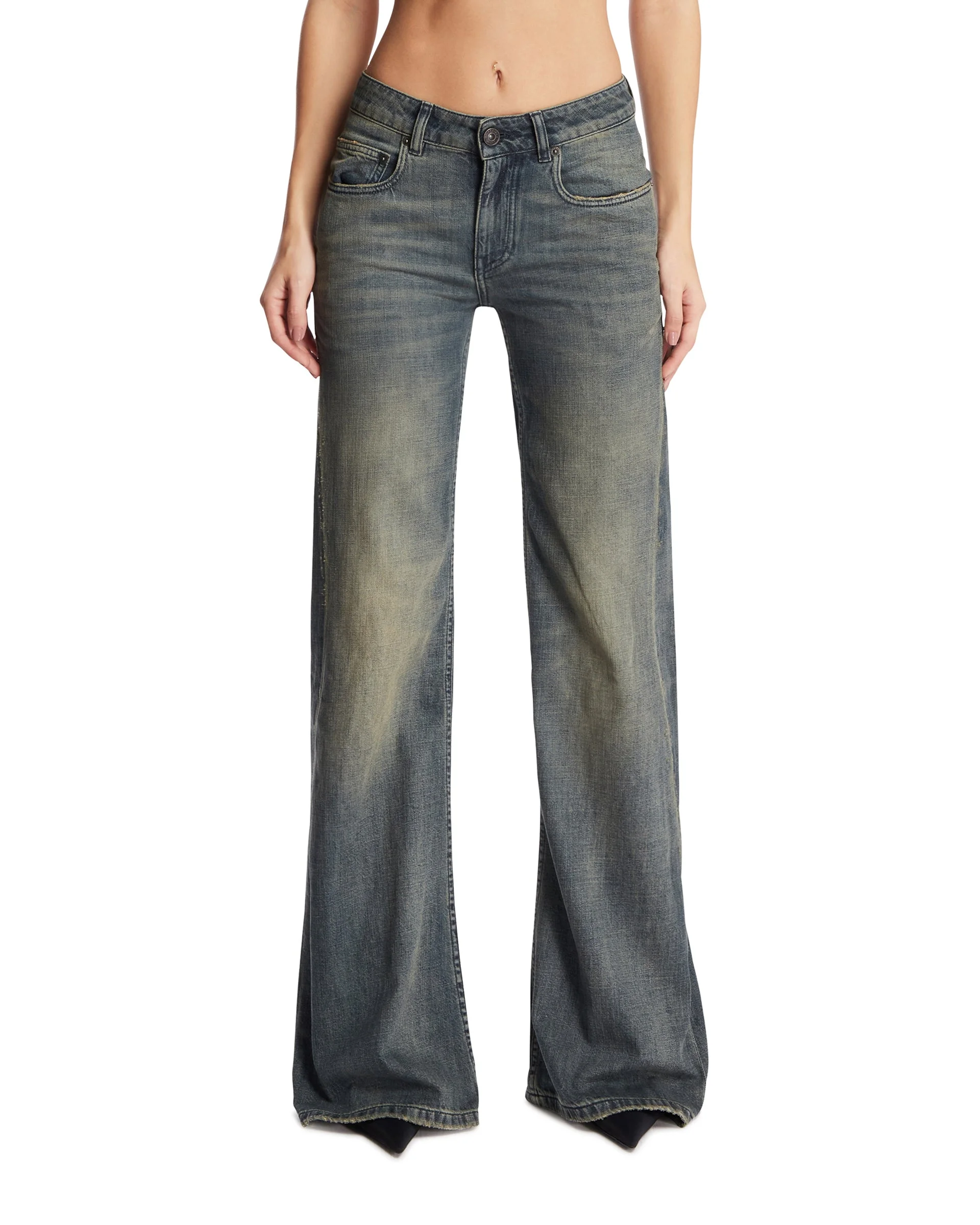 Balenciaga Blue Wide-Leg Pants. Blue denim with a faded and distressed effect. Mid-rise waist, concealed zip fly, five belt loops, classic five-pocket design. Relaxed fit. Laimitri is 177 cm and she is wearing size 26. DETAILS Model: 852328TTW763394 Composition: 100% Cotton Made in: ITALY Season: FW25-26