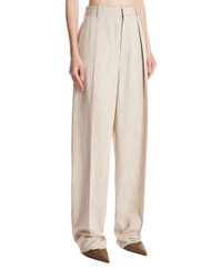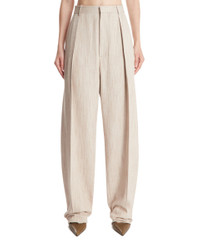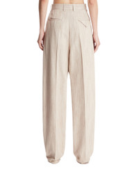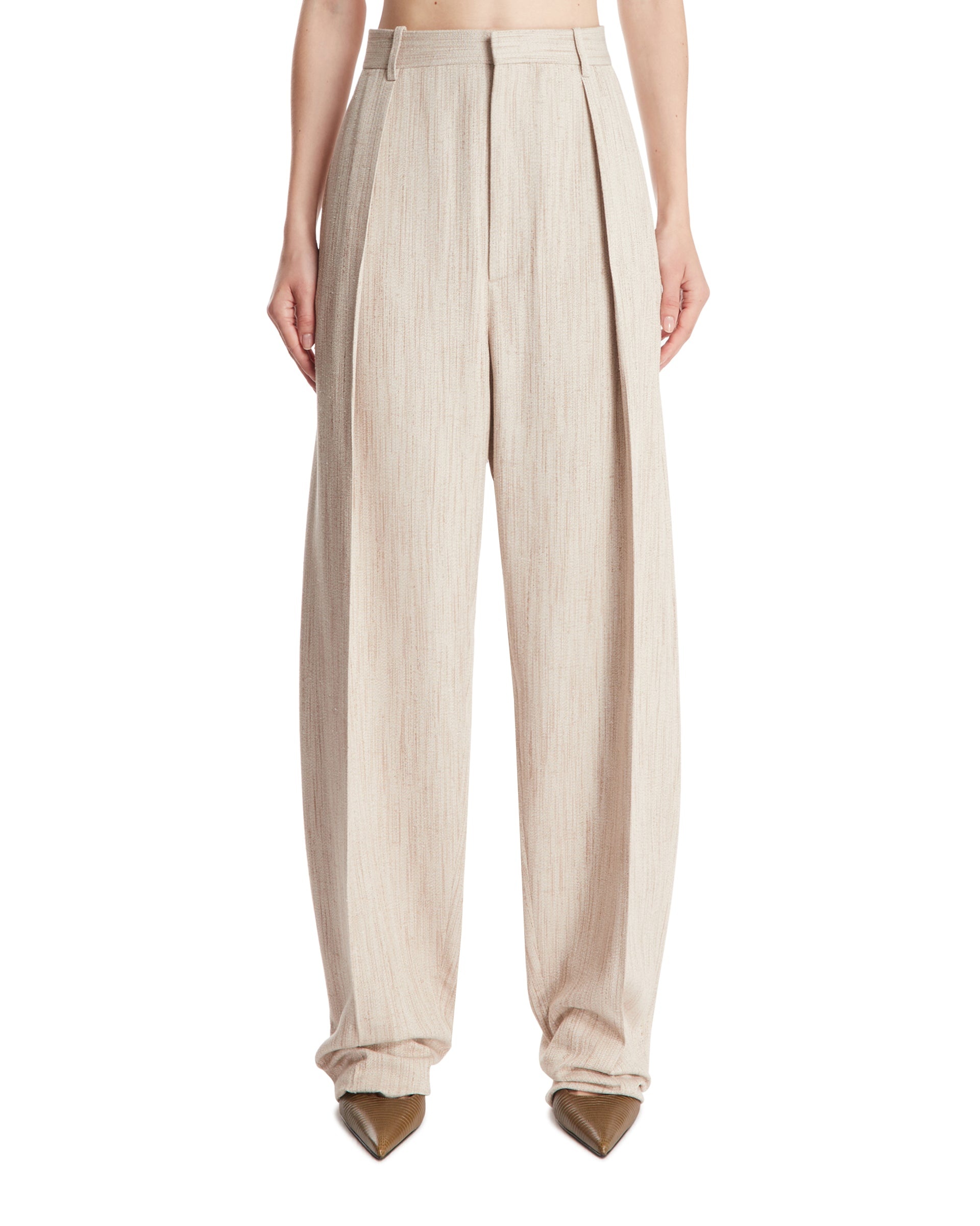 Bottega Veneta Beige Silk and Viscose Pants. Beige silk and viscose blend, tapered leg, regular waist, zip, button, hook closure. Belt loops, three-pocket design. Regular fit. Alicia is 173 cm and she is wearing size 38. DETAILS Model: 830002V5QR02674 Composition: 56% Viscse, 36% Polyester, 8% Silk Made in: ITALY Season: FW25-26