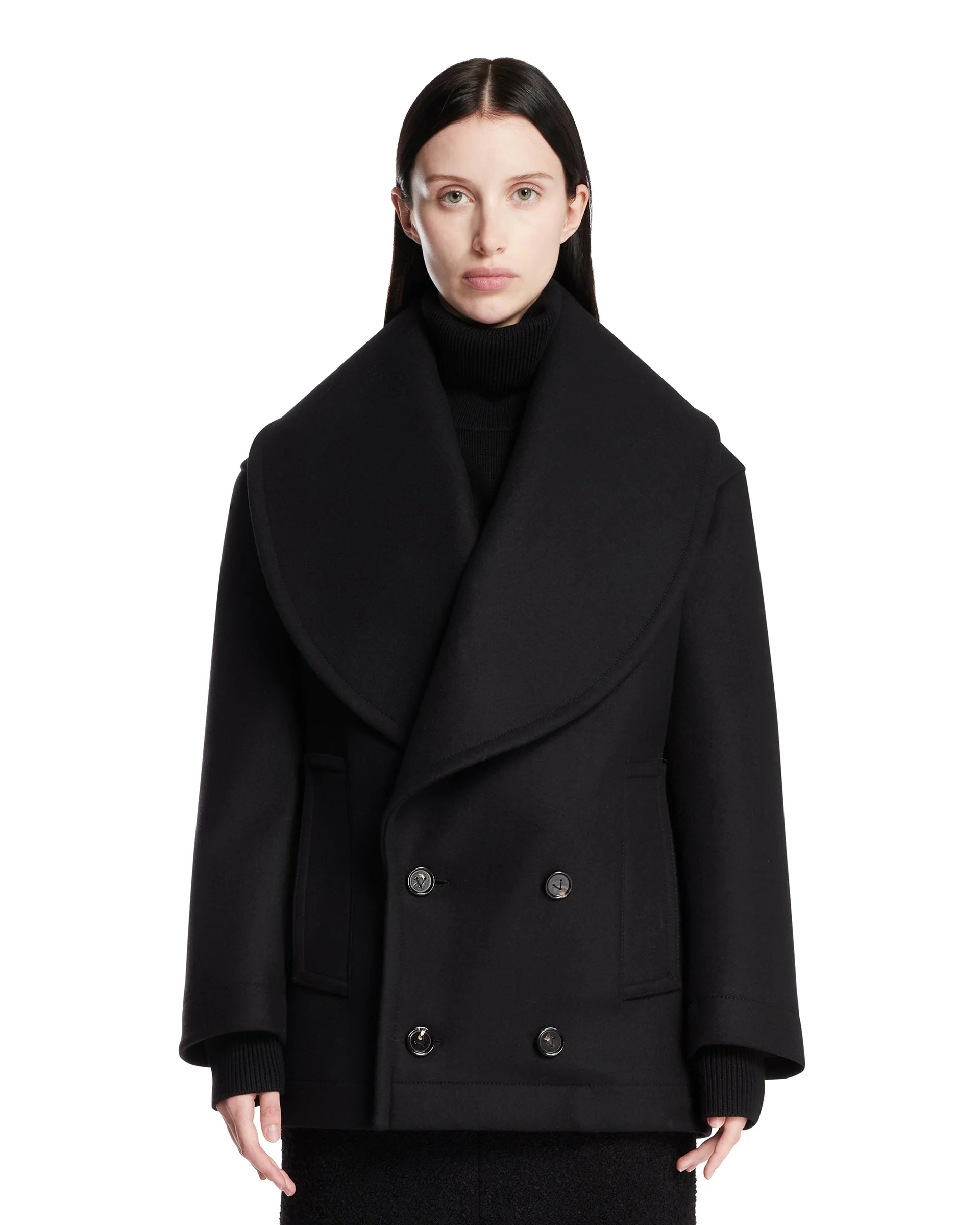 Bottega Veneta Black Double-Breasted Coat. Black wool blend, large notch collar, long sleeves, double-breasted front button closure, back slit, two side pockets, straight hem. Janne is 179 cm and she is wearing size 38. DETAILS Model: 834985V00X01000 Composition: 98% Wool, 1% Polyamide Made in: ITALY Season: FW25-26