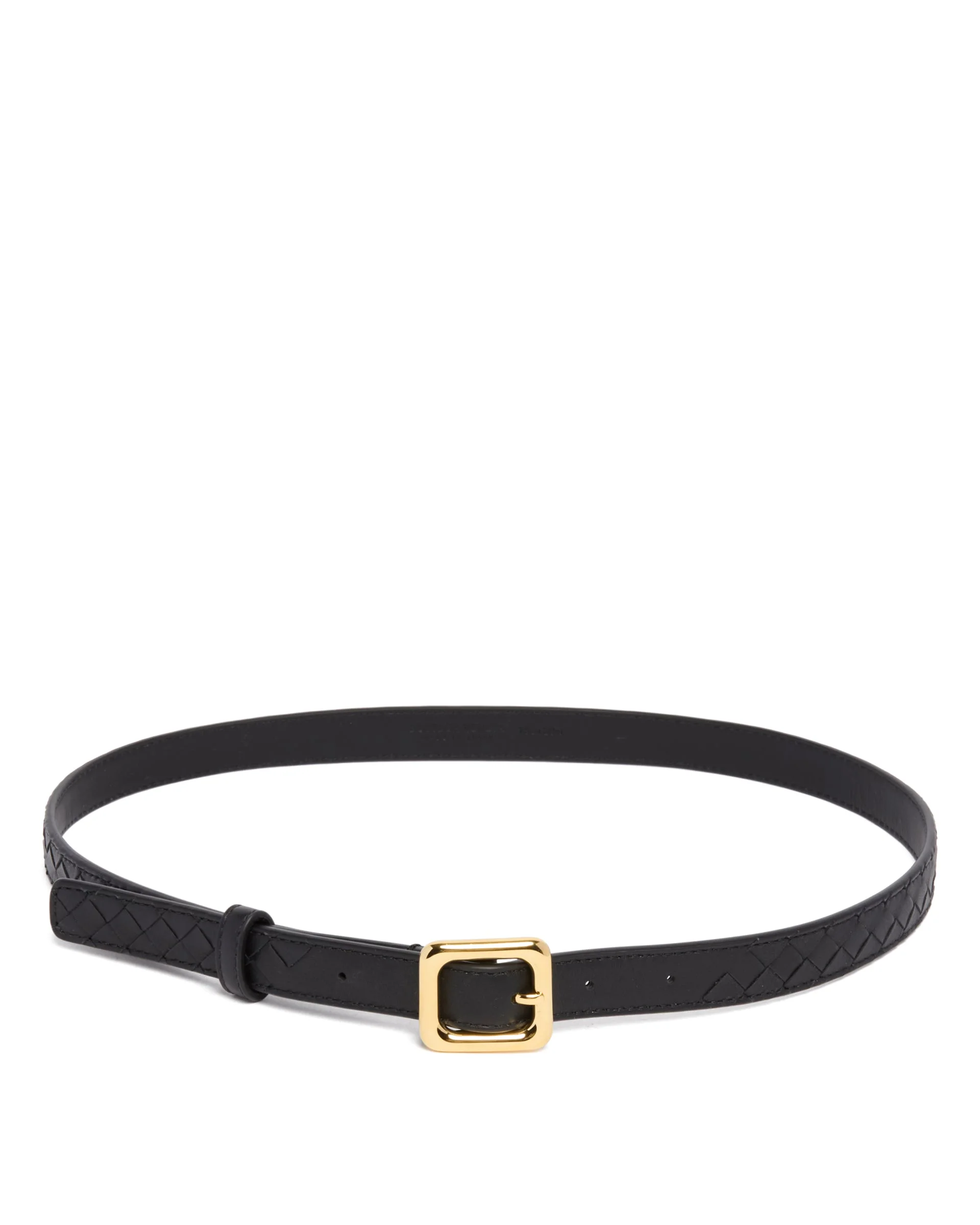 Bottega Veneta Black Leather Intrecciato Belt. Black leather, iconic Intrecciato weave, rectangular gold-tone brass buckle, single loop. DETAILS Model: 843889V5N211019 Composition: 100% Leather; Details: 100% Brass Made in: ITALY Season: FW25-26