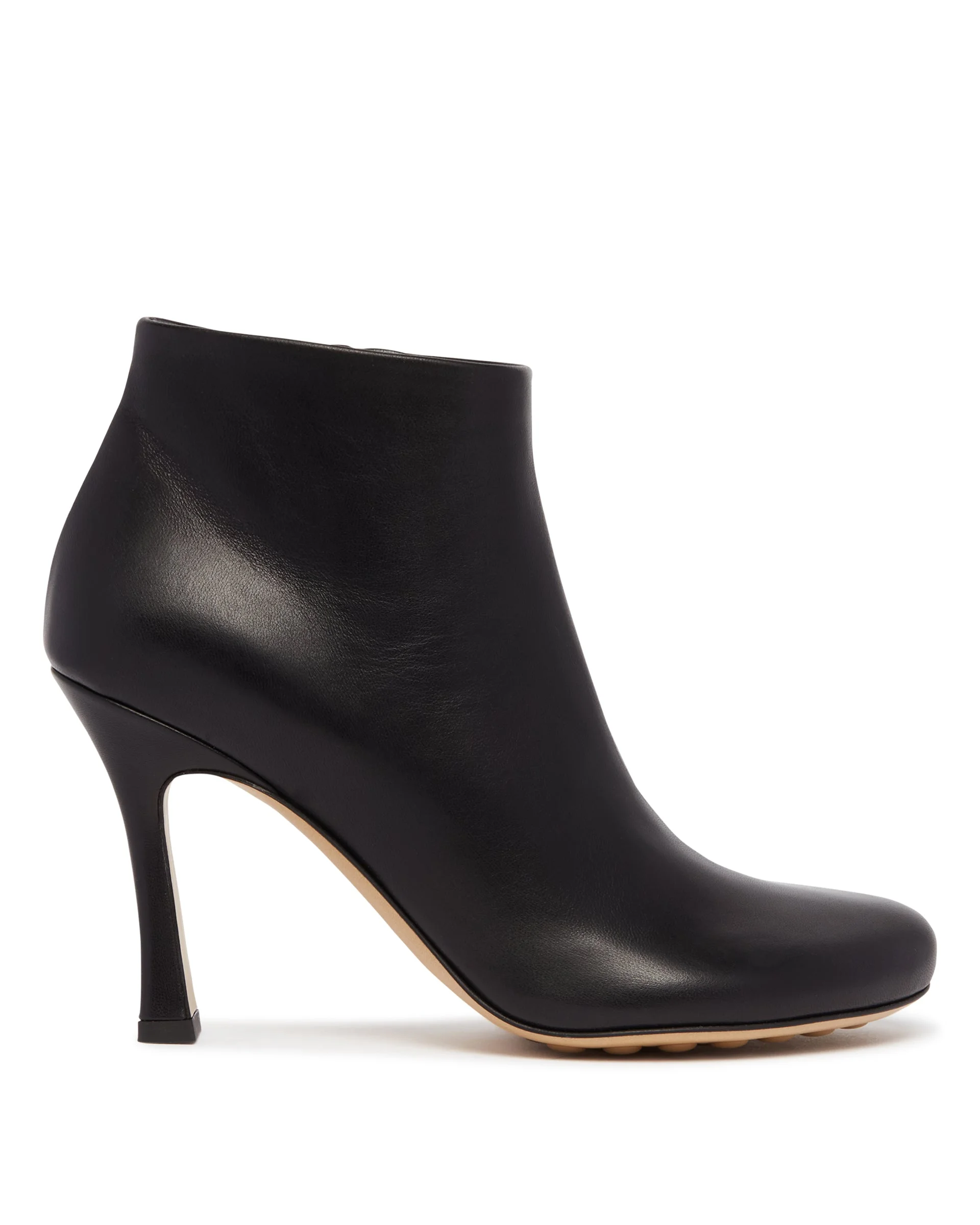 Bottega Veneta Black Rana Ankle Boots. Black leather, almond toe, covered flared heel, inner side zip closure, leather lining, leather sole with rubber inserts. Heel Height: 9 cm DETAILS Model: 843958VBSD01000 Composition: 100% Leather Made in: ITALY Season: FW25-26