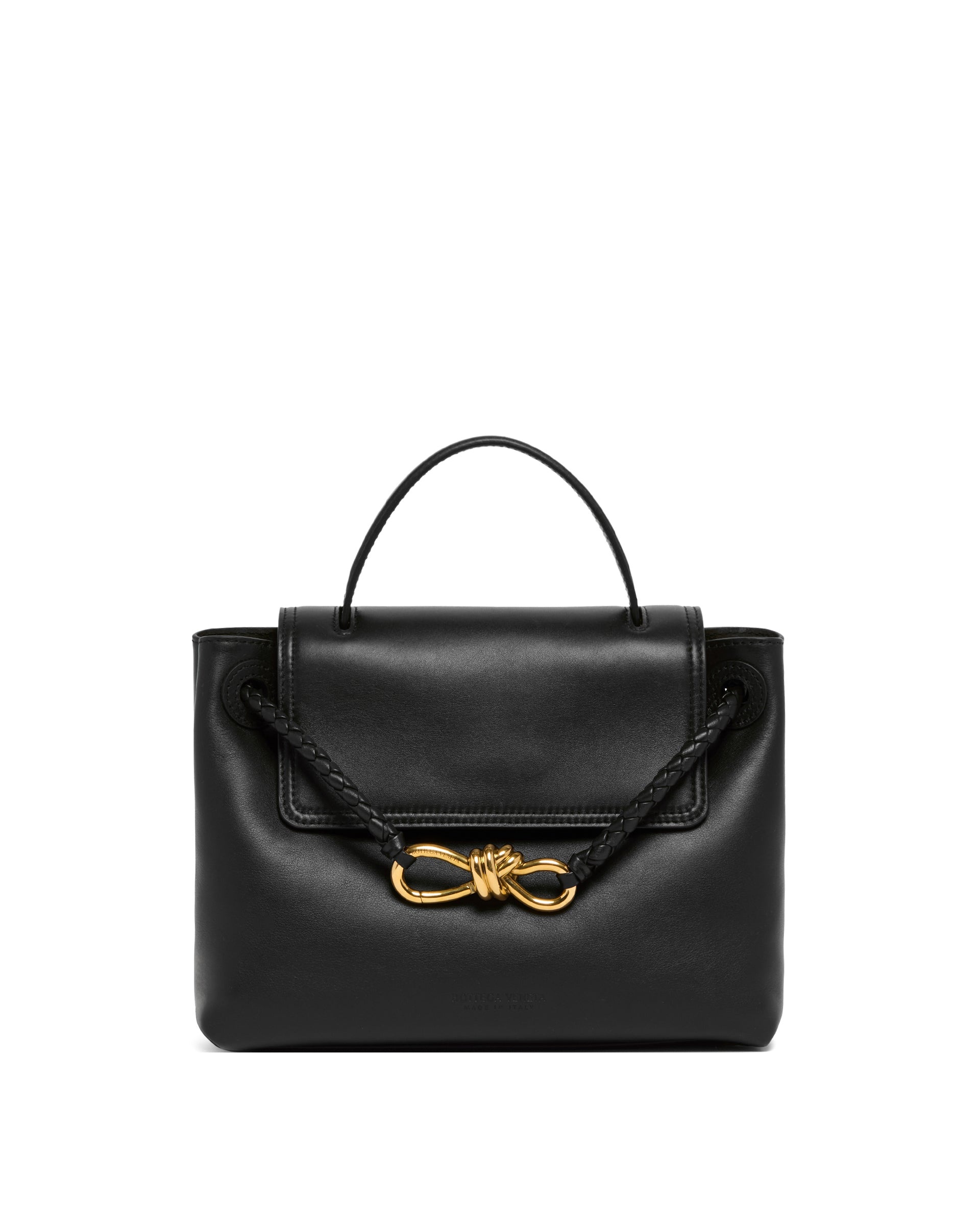 Bottega Veneta Black Small Ciao Ciao Bag. Black leather, top handle, adjustable and removable shoulder strap with the iconic Knot detail. Flap and hook closure, internal pocket with Intrecciato craftsmanship, two compartments, internal zip pocket, brass-t DETAILS Model: 835835V4O921019 Composition: 100% Leather; Details: 100% Brass Made in: ITALY Season: FW25-26
