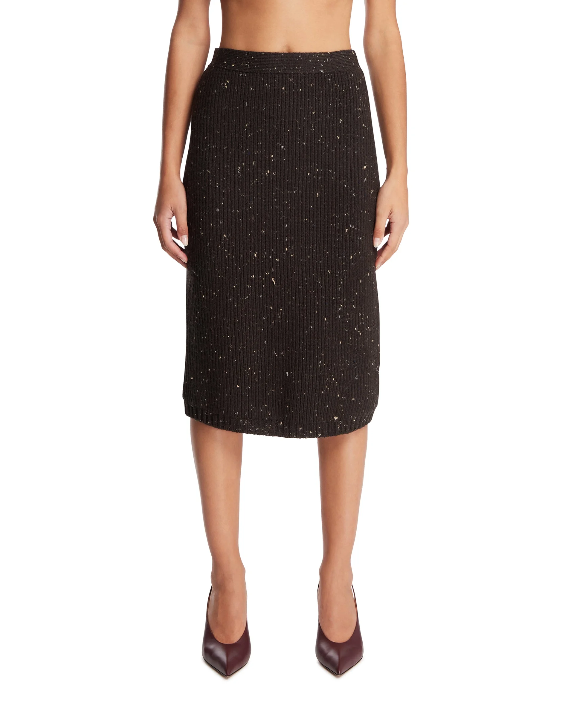 Bottega Veneta Brown English Ribbed Skirt. Brown wool and viscose, english rib knit, elasticized waist, midi length, straight hem. Alicia is 174 cm and she is wearing size S. DETAILS Model: 793108V5LV02113 Composition: 97% Wool, 3% Viscose Made in: ITALY Season: FW25-26