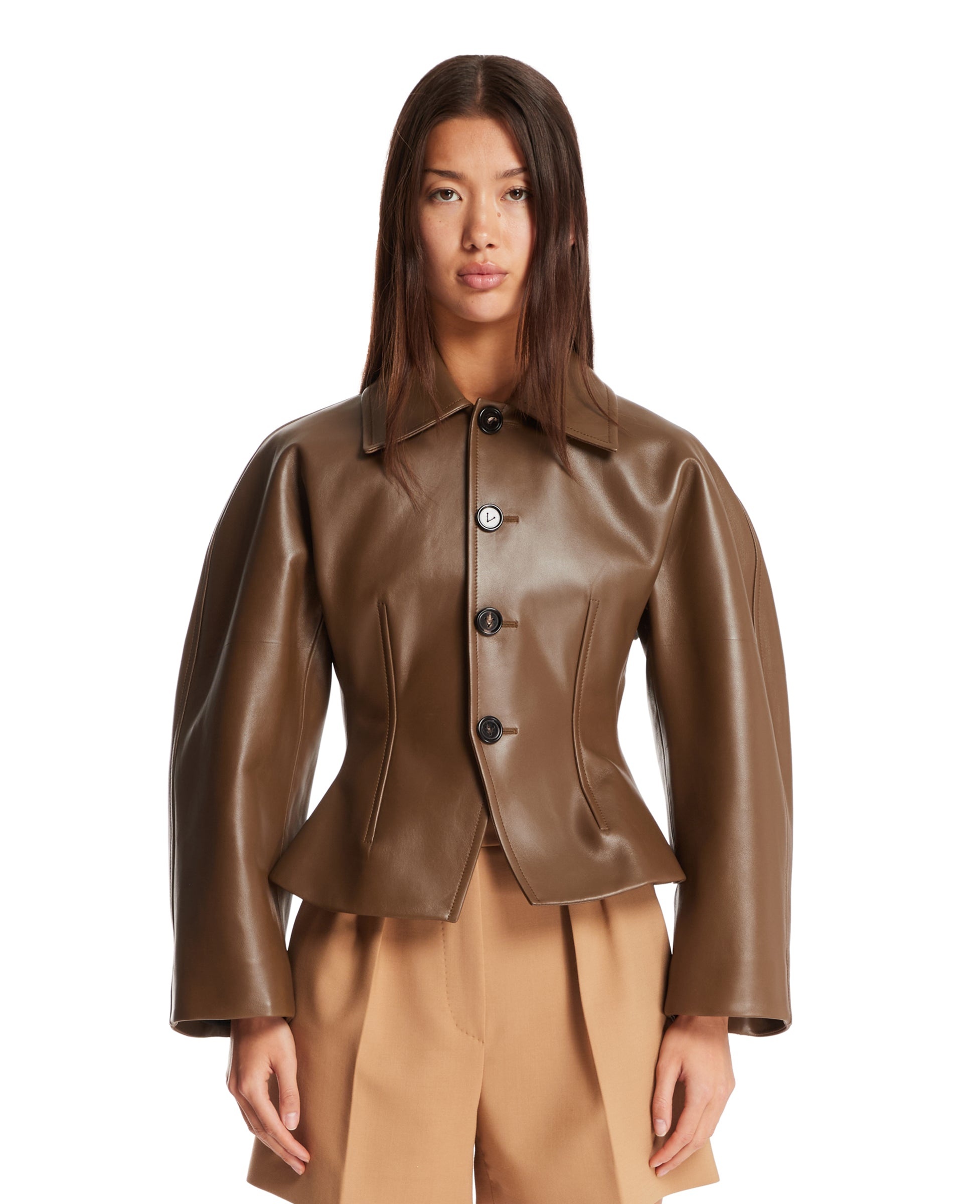 Bottega Veneta Brown Leather Jacket. Brown leather, long sleeves, tailored silhouette, classic collar, front button closure, tone-on-tone stitching, fitted design. Slim fit. Isla is 176 cm and she is wearing size 38. DETAILS Model: 837573V5BX02637 Composition: 100% Leather Made in: ITALY Season: FW25-26