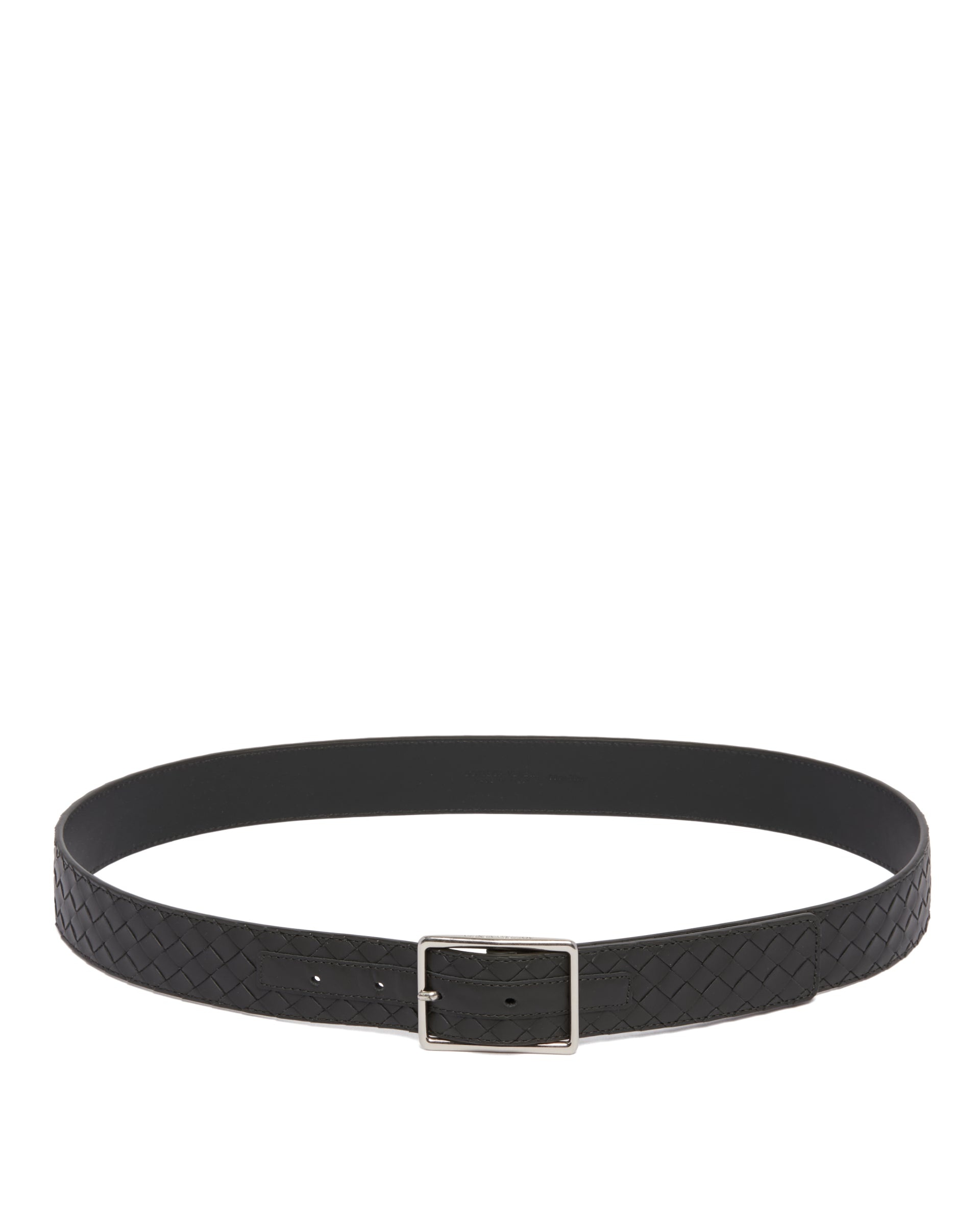 Bottega Veneta Green Intrecciato Leather Belt. Green leather, Intrecciato pattern, buckle closure, silver-tone hardware. DETAILS Model: 796783V4LQ13009 Composition: 100% Leather; Detail: 100% Brass Made in: ITALY Season: FW25-26