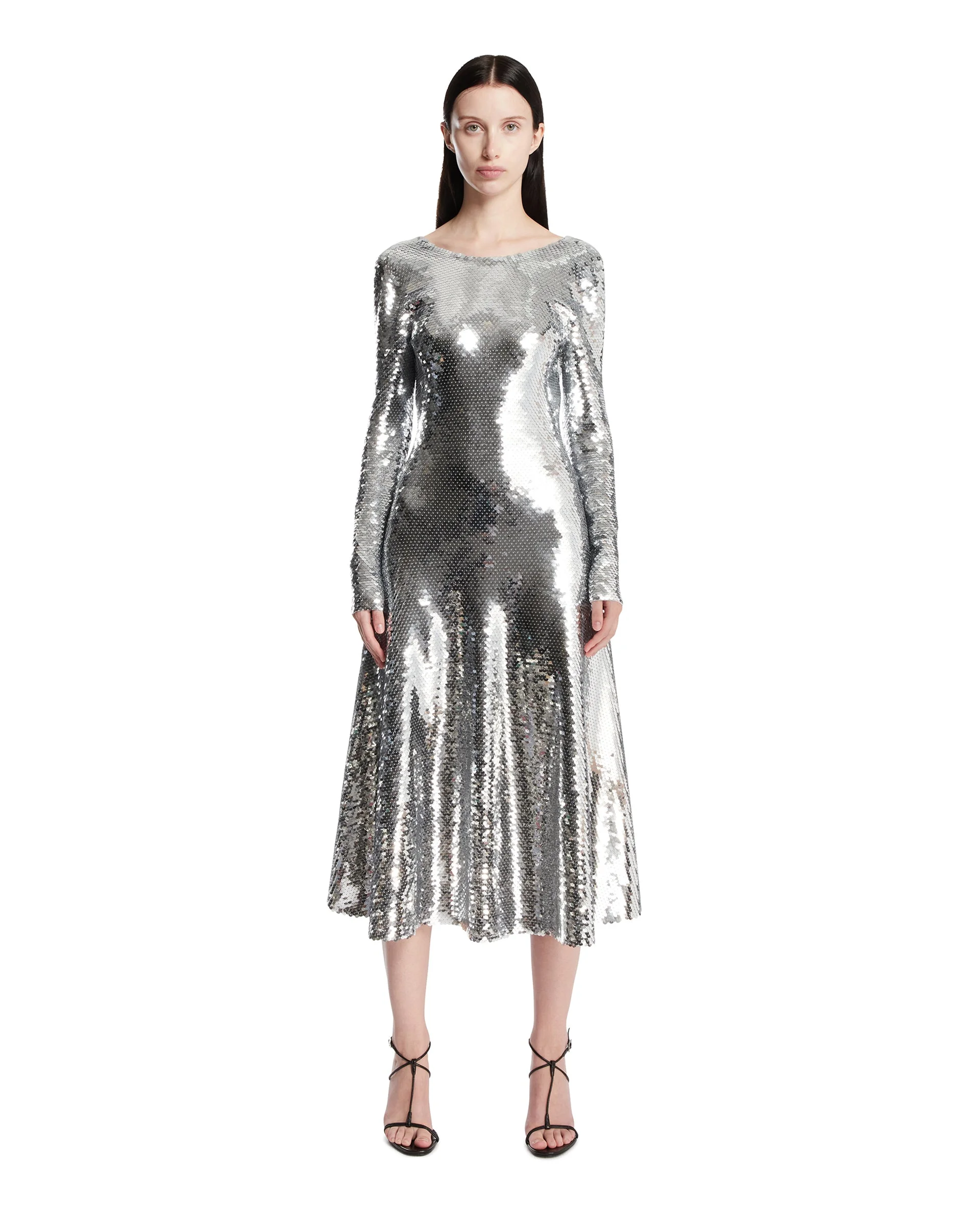 Bottega Veneta Silver Sequin Dress. Viscose blend covered in silver sequins, round neckline at the front, deep neckline at the back, long sleeves, fitted silhouette, straight hem. Janne is 179 cm and she is wearing size S. DETAILS Model: 844039V53Q01156 Composition: 90% Viscose, 8% Polyamide, 2% Elastane Made in: ITALY Season: FW25-26