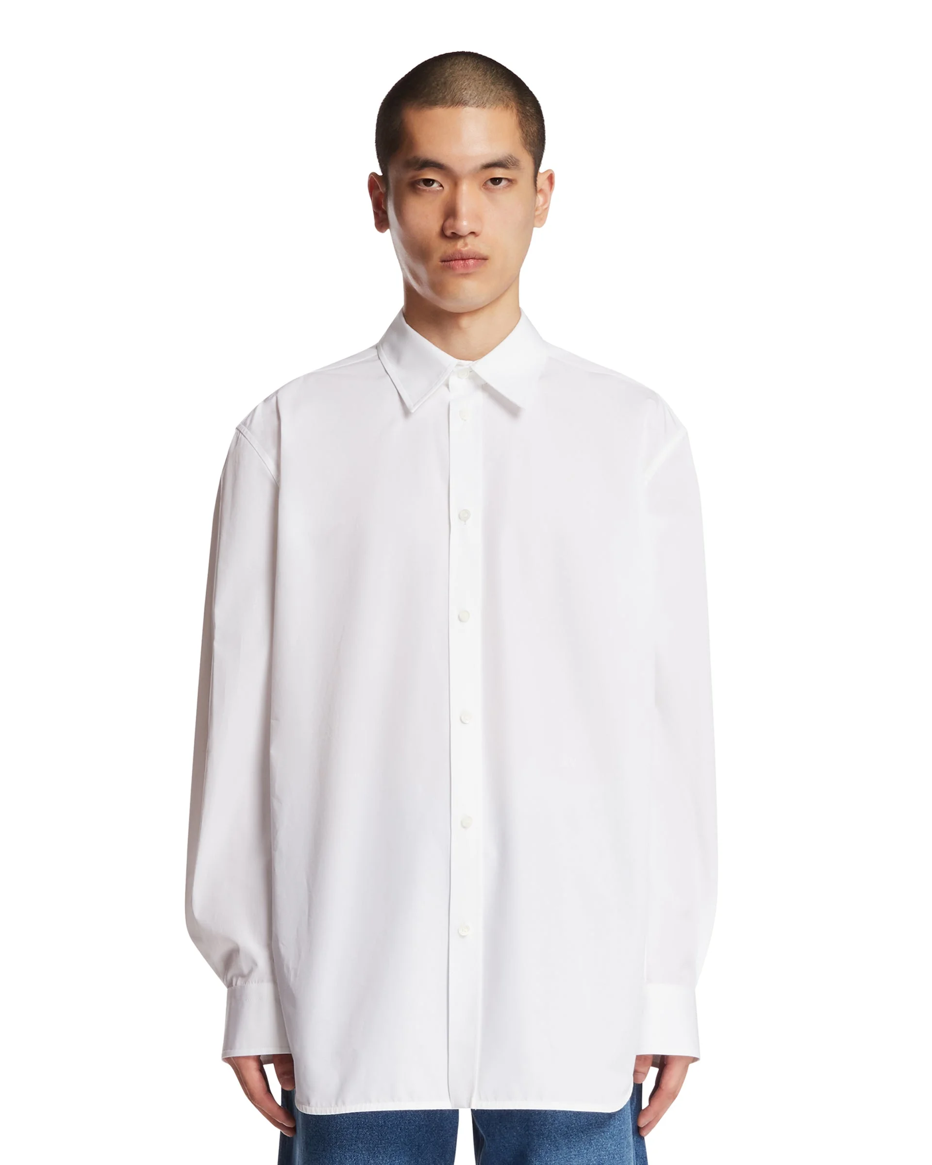 Bottega Veneta White Cotton Poplin Shirt. White cotton, classic collar, long sleeves, front button closure. Relaxed fit. Minyung is 185 cm and he is wearing size 50. DETAILS Model: 861966V6CV09000 Composition: 100% Cotton Made in: ITALY Season: SS26
