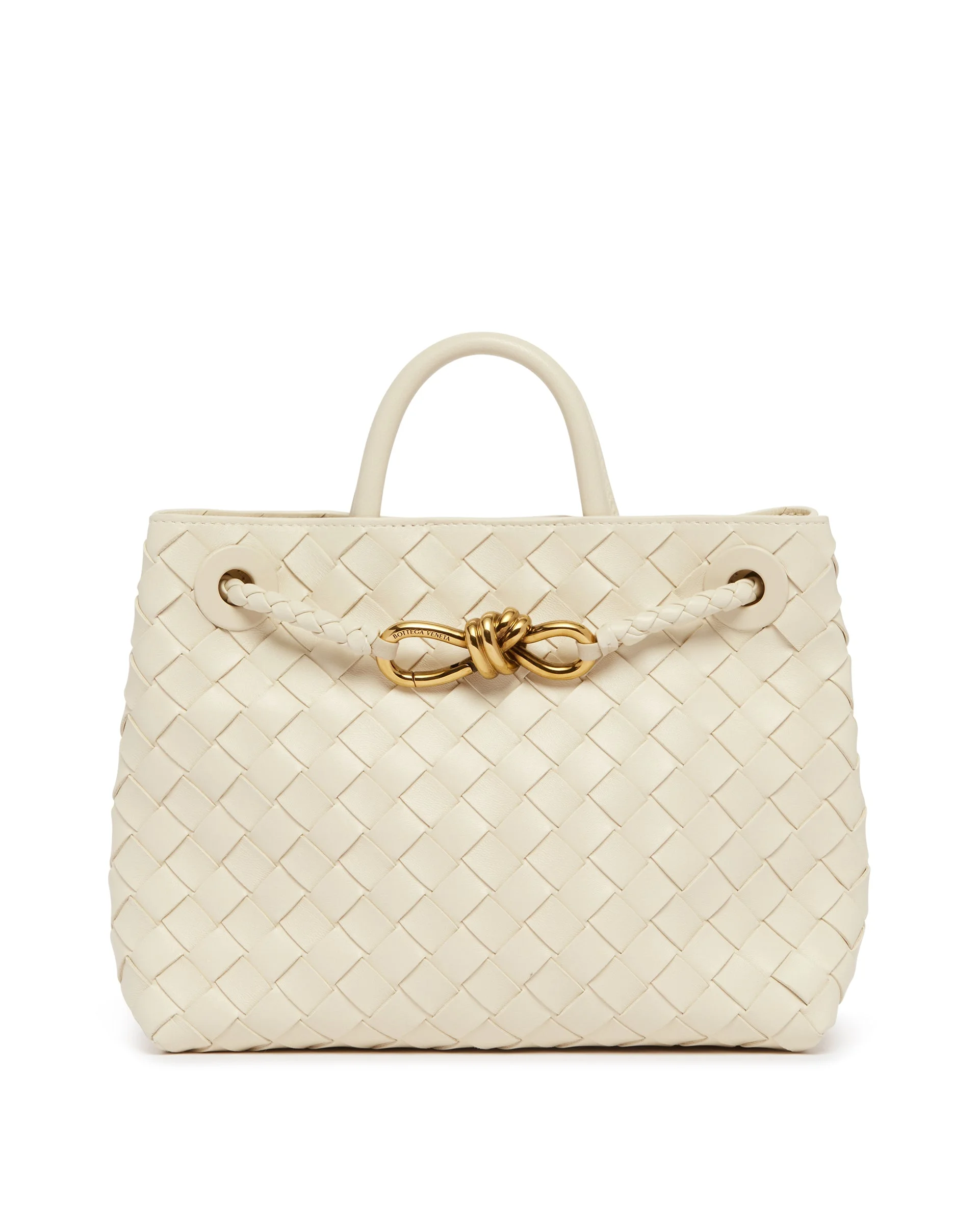 Bottega Veneta White Small Andiamo Bag. White leather, iconic Intrecciato weave, internal compartment with a zip pocket and two open pockets, leather handle. Magnetic closure, adjustable shoulder strap with iconic Knot detail, brass-tone hardware. Size (cm): 25X19X10 DETAILS Model: 766014VCPP19211 Composition: 100% Leather; Details: 100% Brass Made in: ITALY Season: SS25
