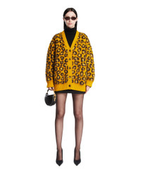 Bottega Veneta Yellow Animal Print Cardigan. Yellow wool blend, mohair and technical fabric with animal print pattern. V-neck, long sleeves, dropped shoulders, ribbed hem and cuffs, front button closure, straight hem. Janne is 179 cm and she is wearing si DETAILS Model: 845600V5MC07103 Composition: 48% Wool, 35% Mohair, 17% Polyamide Made in: ITALY Season: FW25-26