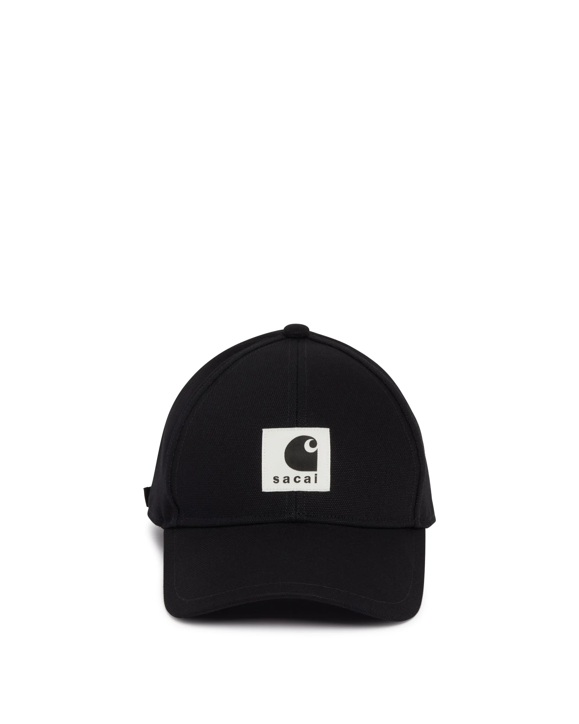Sacai x Carhartt WIP Black Logo Cap. Black cotton, tone-on-tone visor, logo on the front, adjustable back strap with a brass buckle. DETAILS Model: 2601093S001 Composition: 100% Cotton; Detail: 100% Brass Made in: JAPAN Season: SS26