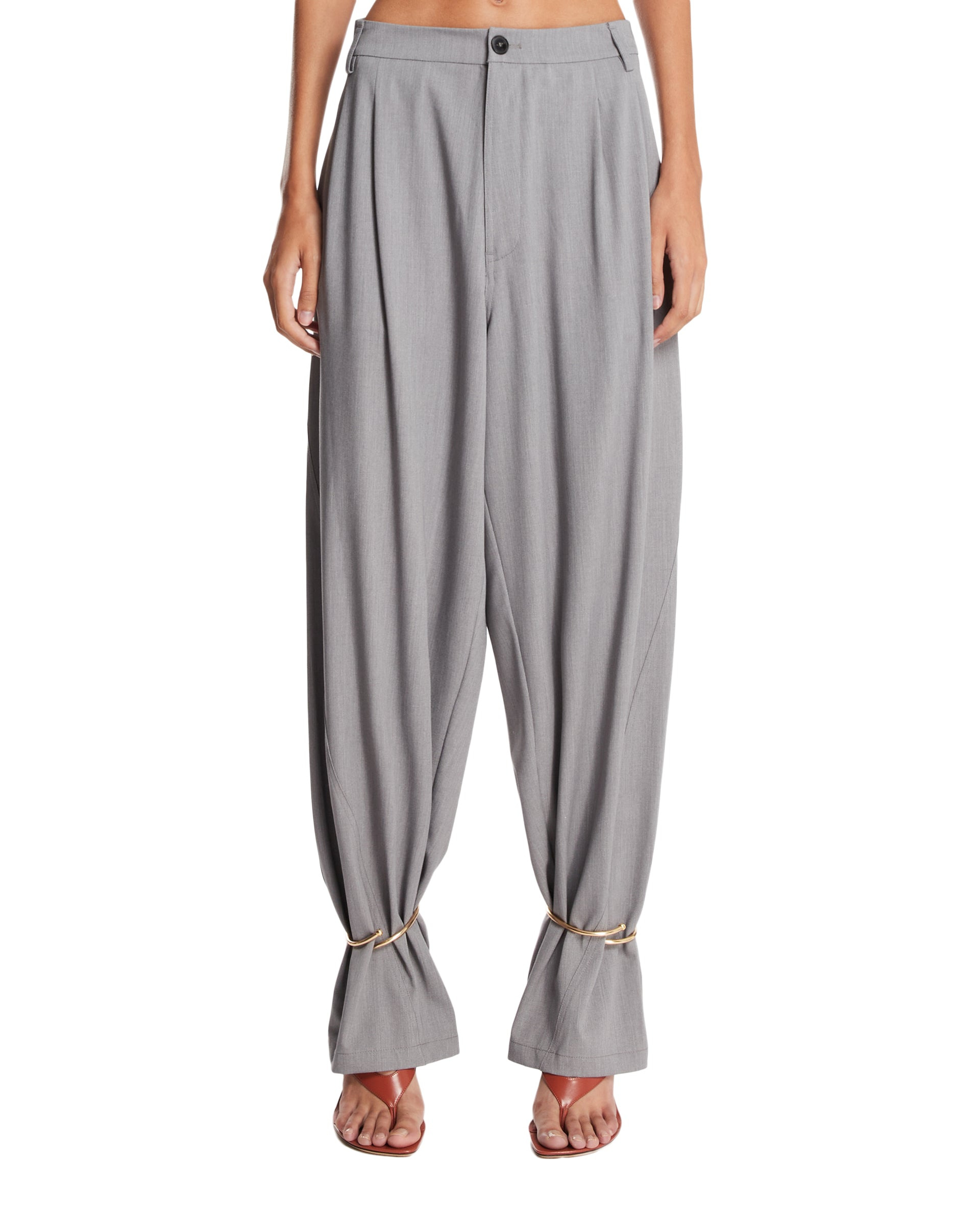 Darkpark Gray Ankle Cuff Trousers. Gray technical fabric, regular waist, front closure with button and zipper, belt loops. Wide leg, low crotch, removable rigid brass cuffs at the ankles. Regular fit. Anna is 178 cm and she is wearing size 36. DETAILS Model: WTR36AFAW440072 Composition: 62% Polyester, 25% Viscose, 8% Wool, 5% Elastane; Detail. 100% Brass Made in: ITALY Season: FW25-26