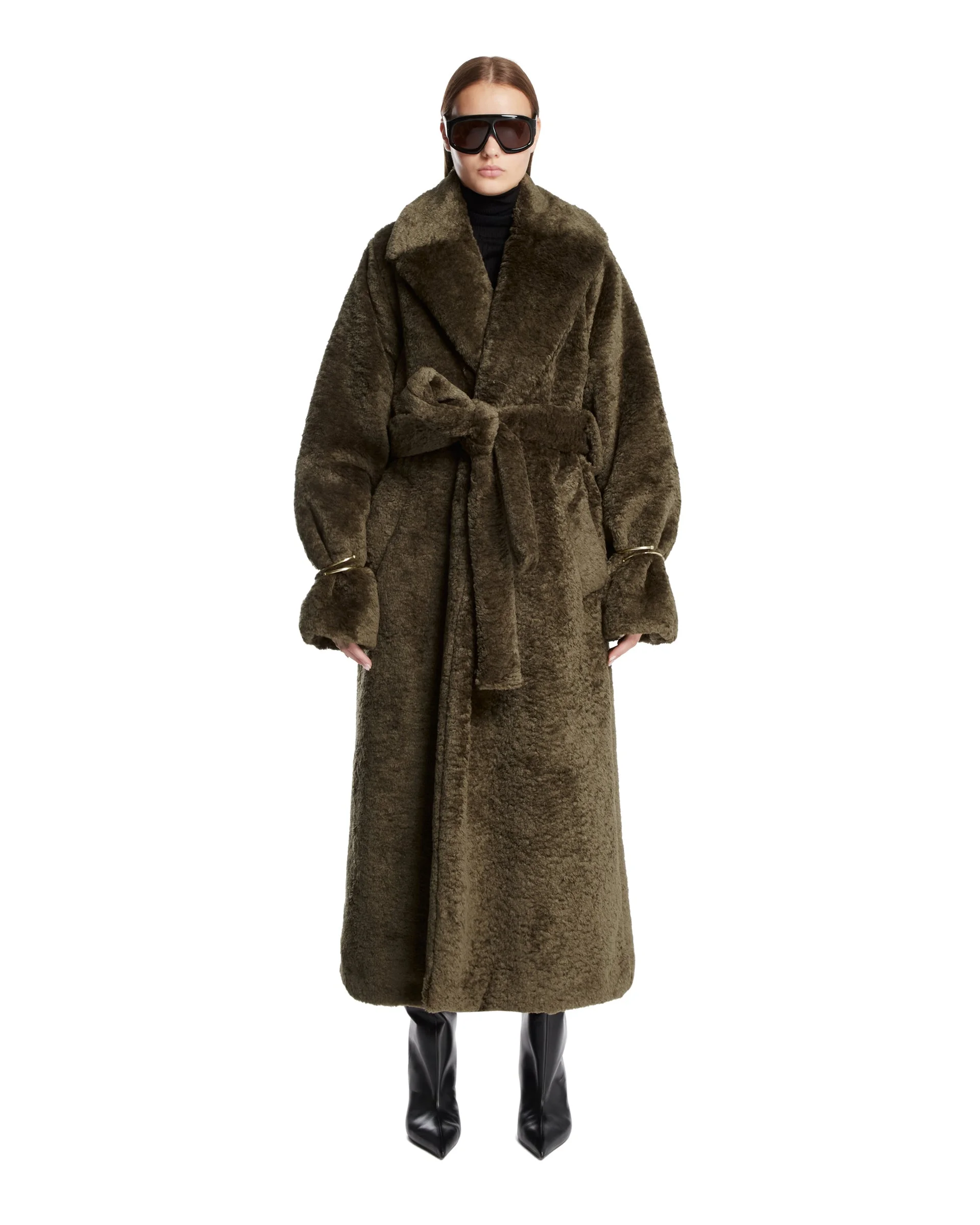 Darkpark Green Madison Faux Fur Trench Coat. Green faux fur, oversized lapels, long sleeves, removable rigid cuffs at the wrists, detachable tone-on-tone belt, side pockets. Relaxed fit. Perla is 176 cm and she is wearing size S. DETAILS Model: WOU20FAC1110061 Composition: 100% Polyester; Details: 100% Brass Made in: ITALY Season: FW25-26