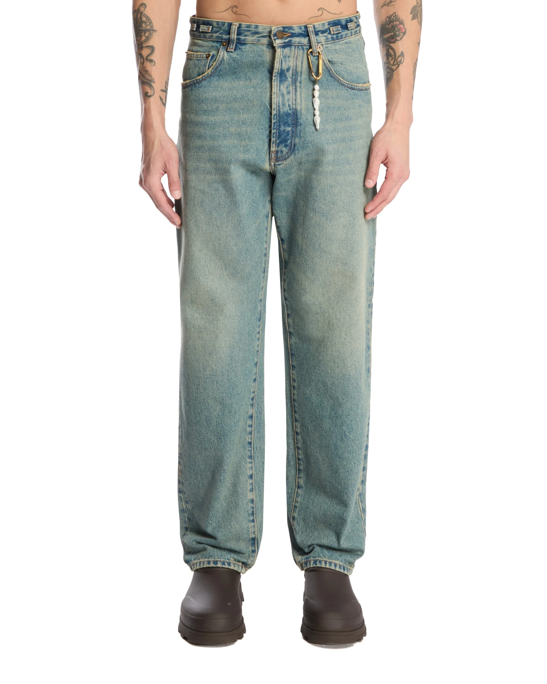 Darkpark Light Blue Straight-Leg Jeans. Light blue washed cotton denim, high waist, belt loops, 5-pocket design, straight leg, front button and zip closure. Logo tag on the back, removable keychain with carabiner, relaxed fit. Leandro is 187 cm and he is wearing size 31. DETAILS Model: MTR02DBL01W055 Composition: 100% Cotton Made in: ITALY Season: SS25