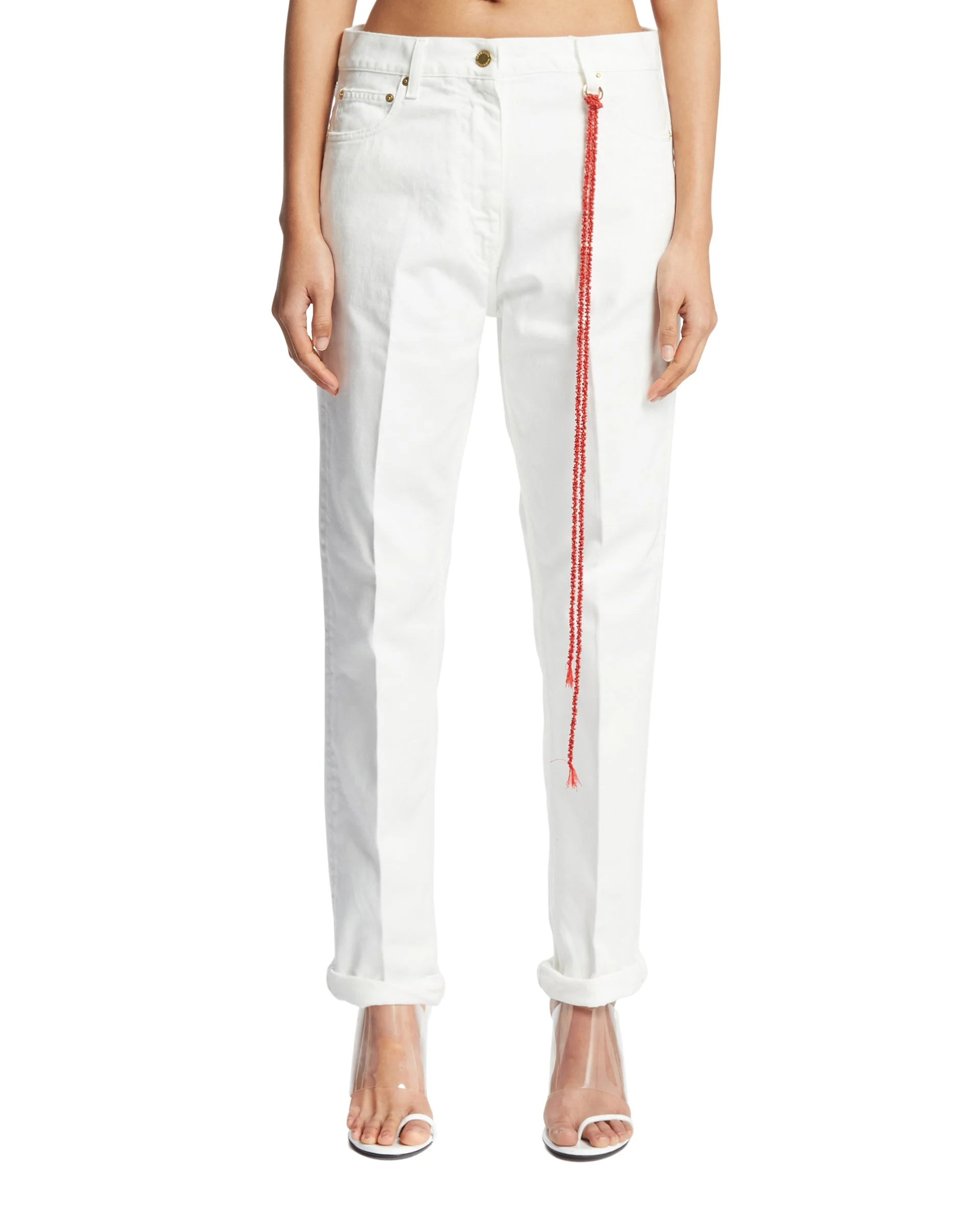 Darkpark White Five-Pocket Pants. White cotton, hidden front button closure, belt loops, pressed pleats, 5-pocket design, logo label on the back. Removable beaded keychain detail, straight leg with a cuffed hem. Zai is 178 cm and she is wearing size 25. DETAILS Model: WTR38DWB01W008 Composition: 100% Cotton, Deatils. 100% Acetate Made in: ITALY Season: SS25