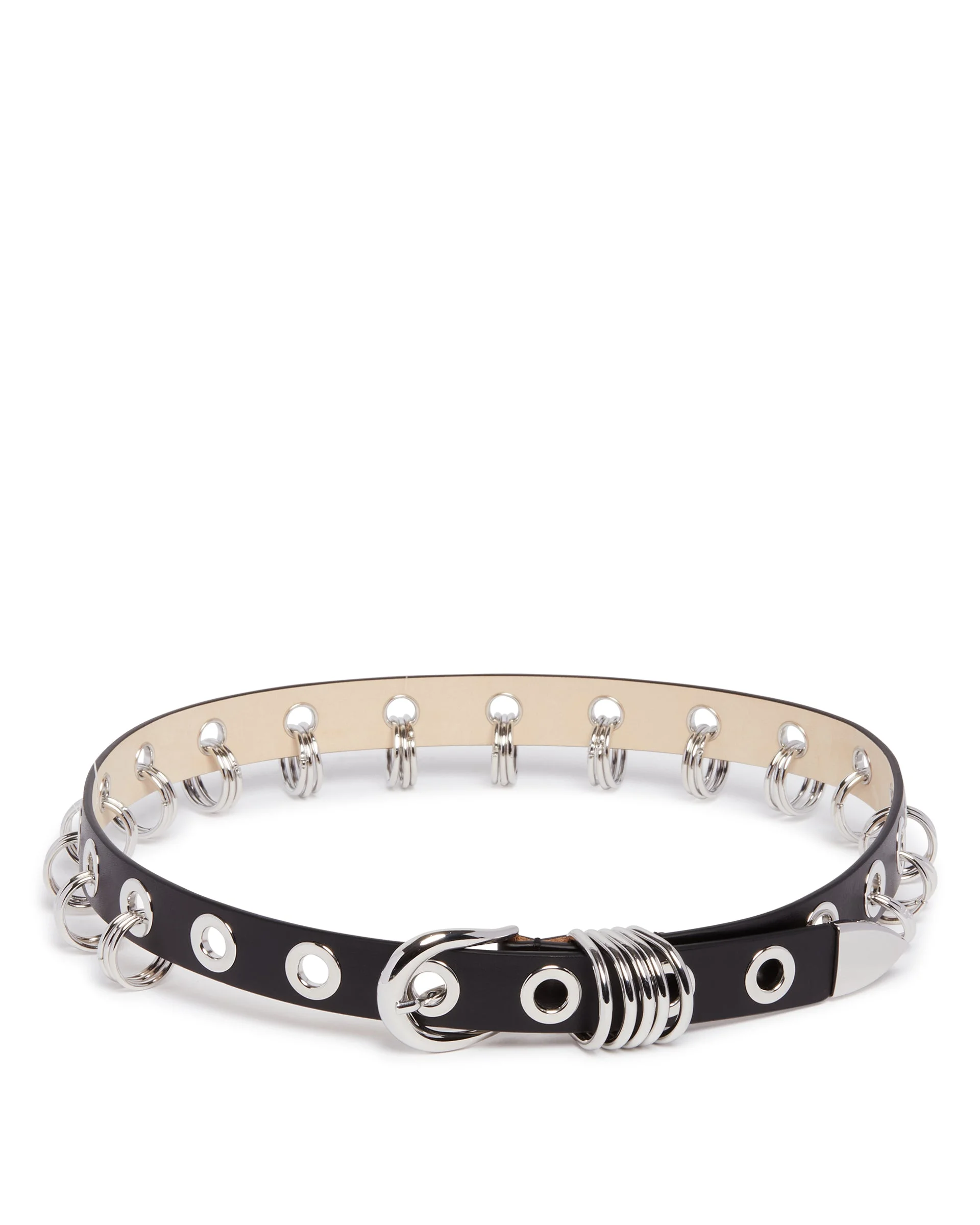 Dehanche Black Revenge Leather Belt. Black leather, punk-inspired aesthetic, hand-applied silver eyelets and rings. Silver-tone hardware. DETAILS Model: REVGSBLS Composition: 100% Leather; Details: 100% Brass Made in: ITALY Season: SS26