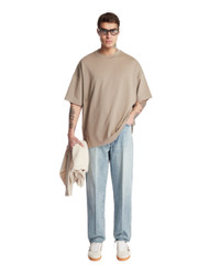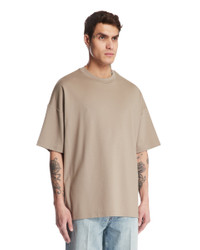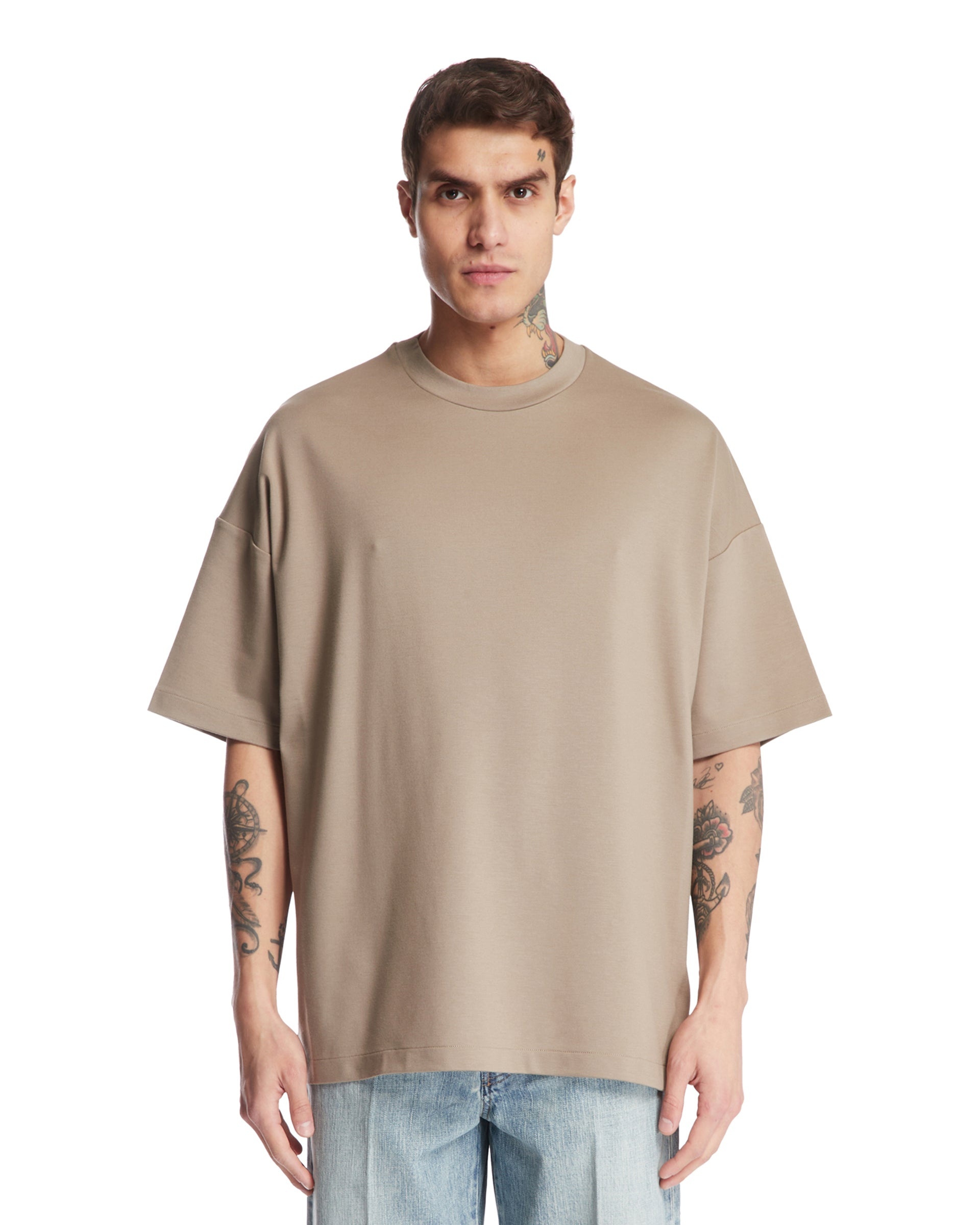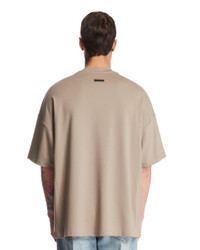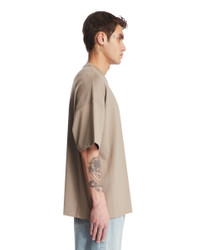 Fear Of God Beige Basic T-Shirt. Beige viscose blend and technical fabric, crew neck, short sleeves, dropped shoulders, iconic logo tag on the back, oversized silhouette, straight hem. Leandro is 187 cm and he is wearing size M. DETAILS Model: FGE250520VISDUSTYBEIGE Composition: 94% Viscose, 6% Elastane Made in: ITALY Season: SS25