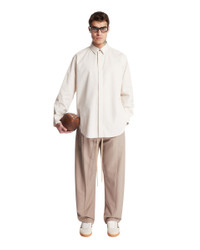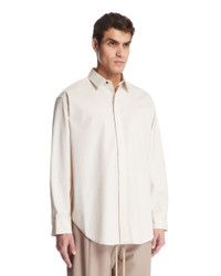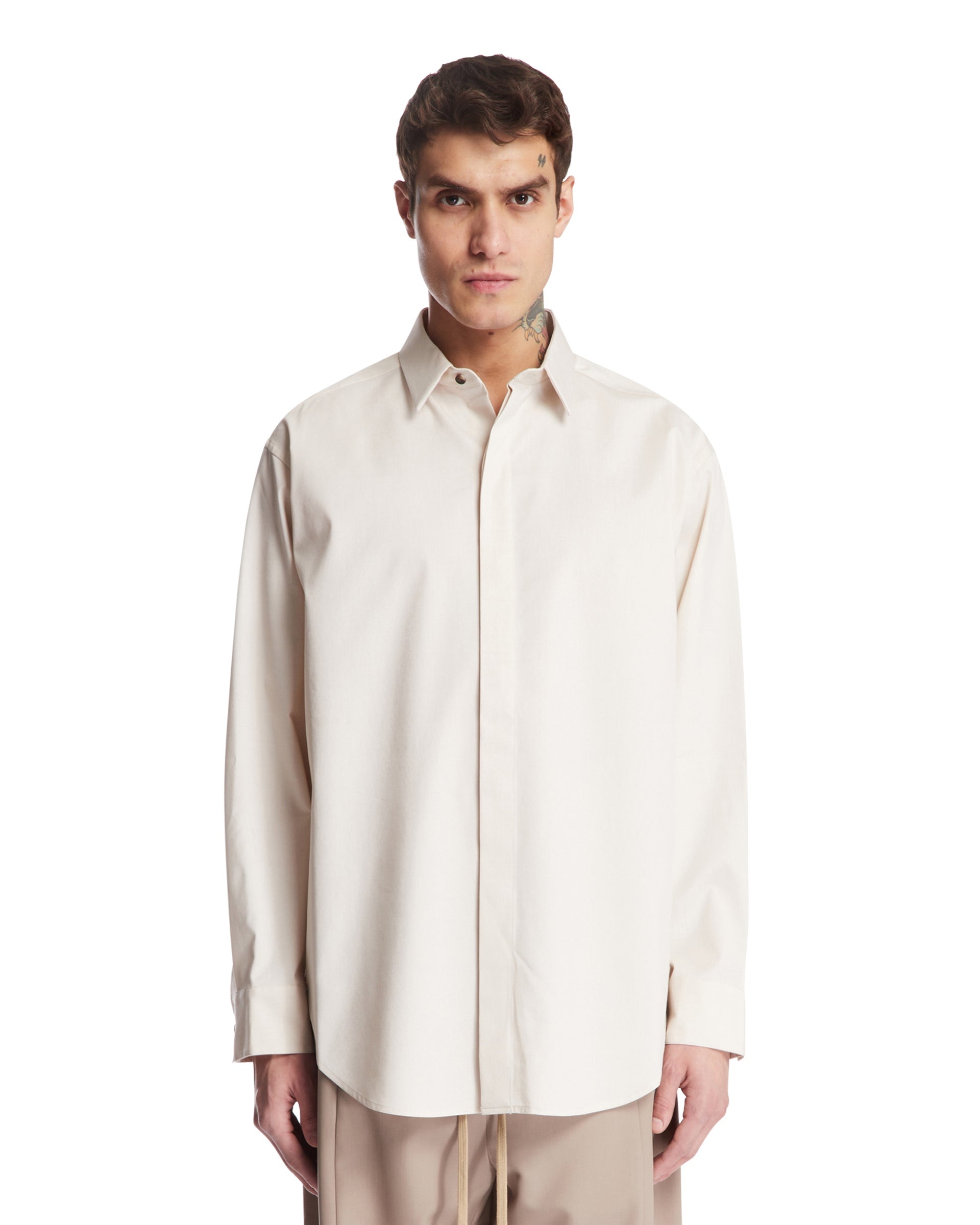 Fear Of God Beige Long Sleeve Shirt. Beige cotton, hidden front button closure, classic collar, long sleeves, buttoned cuffs. Curved hem, regular fit. Leandro is 187 cm and he is wearing size M. DETAILS Model: FGE250501OXFCream Composition: 52% Cotton, 46%Virgin Wool, 2% Elastane Made in: ROMANIA Season: SS25