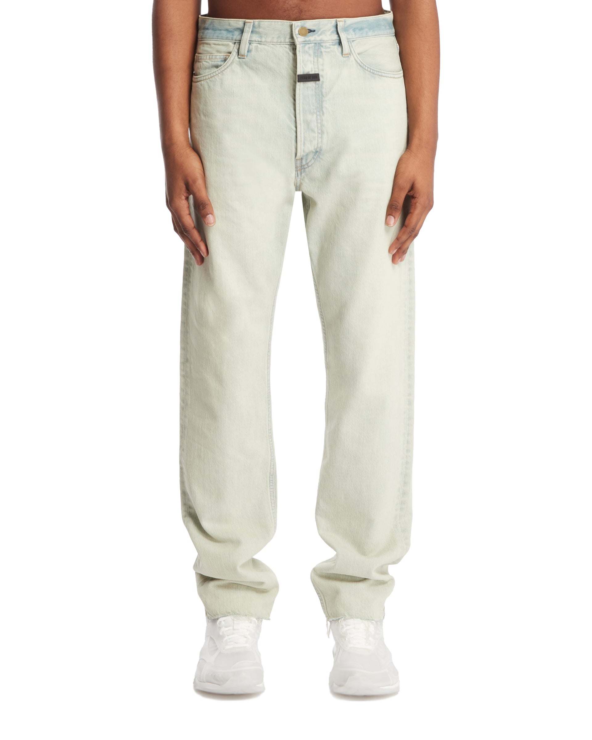 Fear Of God Blue 5-Pocket Jeans. Blue cotton, belt loops, five-pocket design, leather logo tag on the button fly. Raw hem at the bottom, antique brass hardware with engraved logo. Regular fit. Giovanni is 188 cm and he is wearing size 31. DETAILS Model: FGE240408DNMINDIGO Composition: 100% Cotton Made in: JAPAN Season: SS25