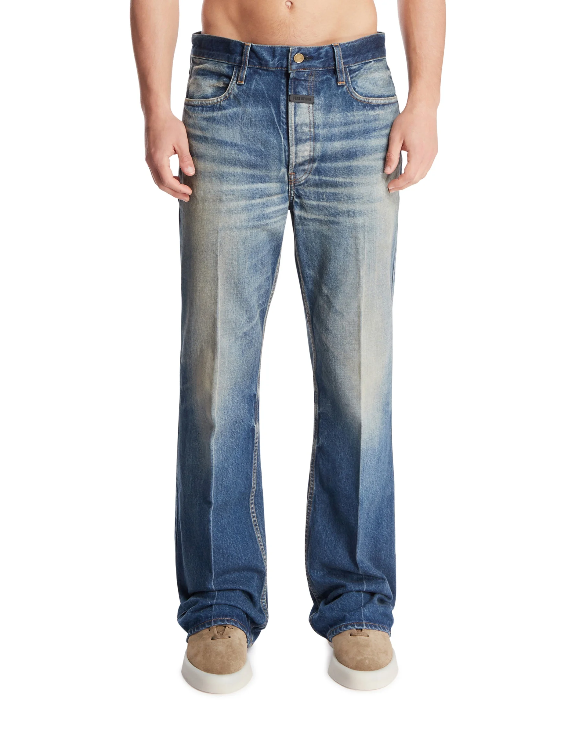 Fear of God Blue Cotton 70s Jeans. Blue cotton denim with a faded finish. Concealed front button fastening, belt loops, pressed pleats, five-pocket styling. Flared legs, iconic logo label on front panel, straight hem. Mitar is 186 cm and he is wearing size 31. DETAILS Model: FG25FW45455DNM411 Composition: 100% Cotton; Detail: 100% Leather Made in: JAPAN Season: FW25-26