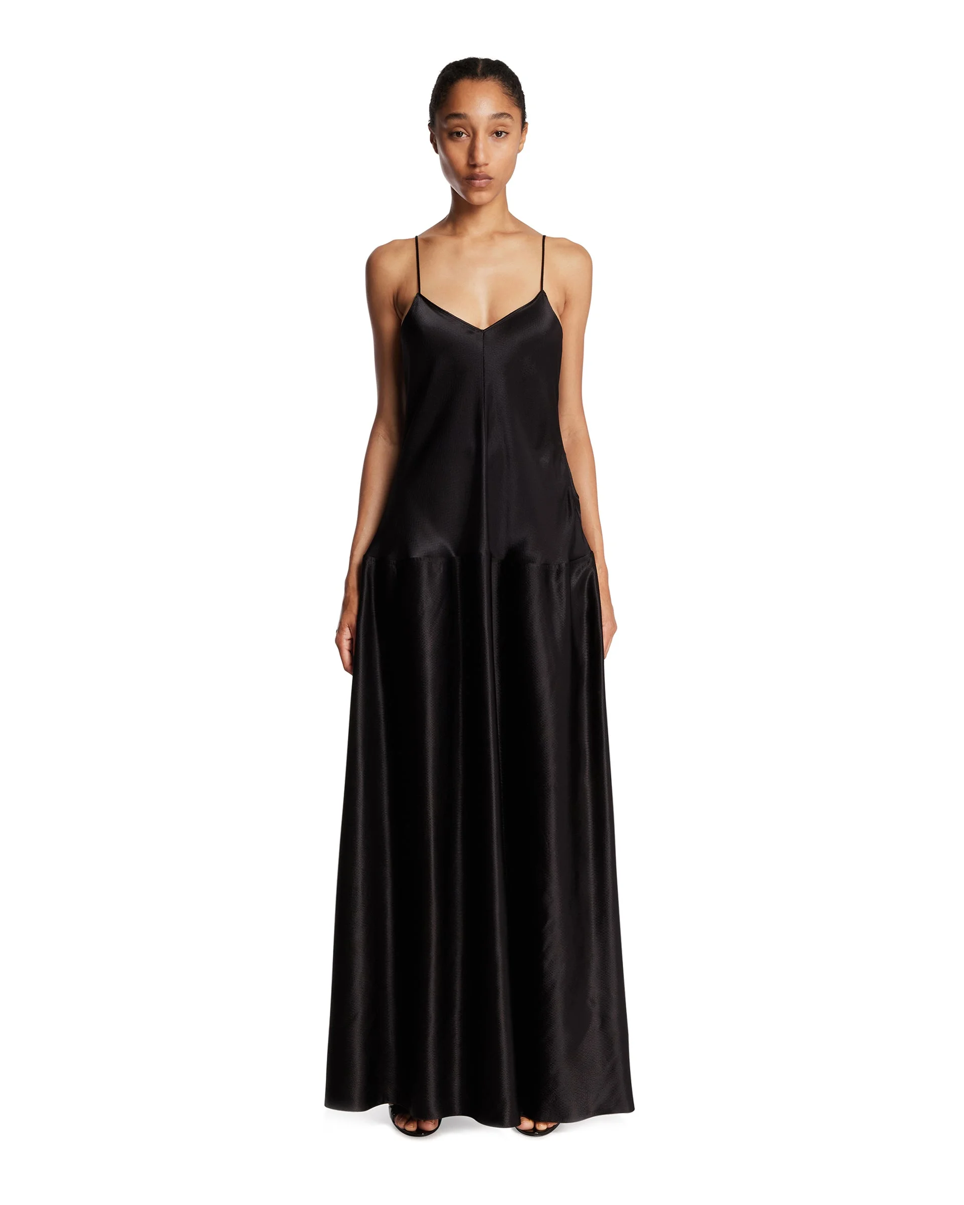 Fforme Black Layla Maxi Dress. Black viscose, adjustable thin straps, bias-cut bodice. Floor-length, light gathering along the hips, regular fit. Aline is 180 cm and she is wearing size 40. DETAILS Model: FF00526VI2514001 Composition: 100% Viscose Made in: ITALY Season: FW25-26