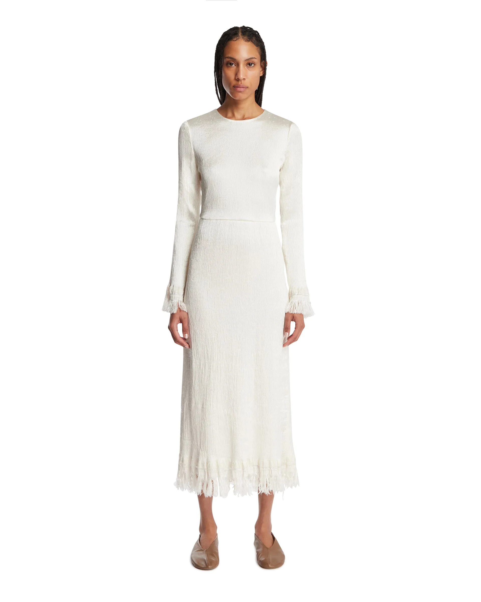 Fforme White Mina Dress. Made from textured white silk blend. Crew neck, long sleeves, fringed edges, invisible zip closure at the back, straight hem. Faelly is 178 cm and she is wearing size 40. DETAILS Model: FF00609SI2514281 Composition: 65% Silk, 35% Polyester Made in: ITALY Season: SS26