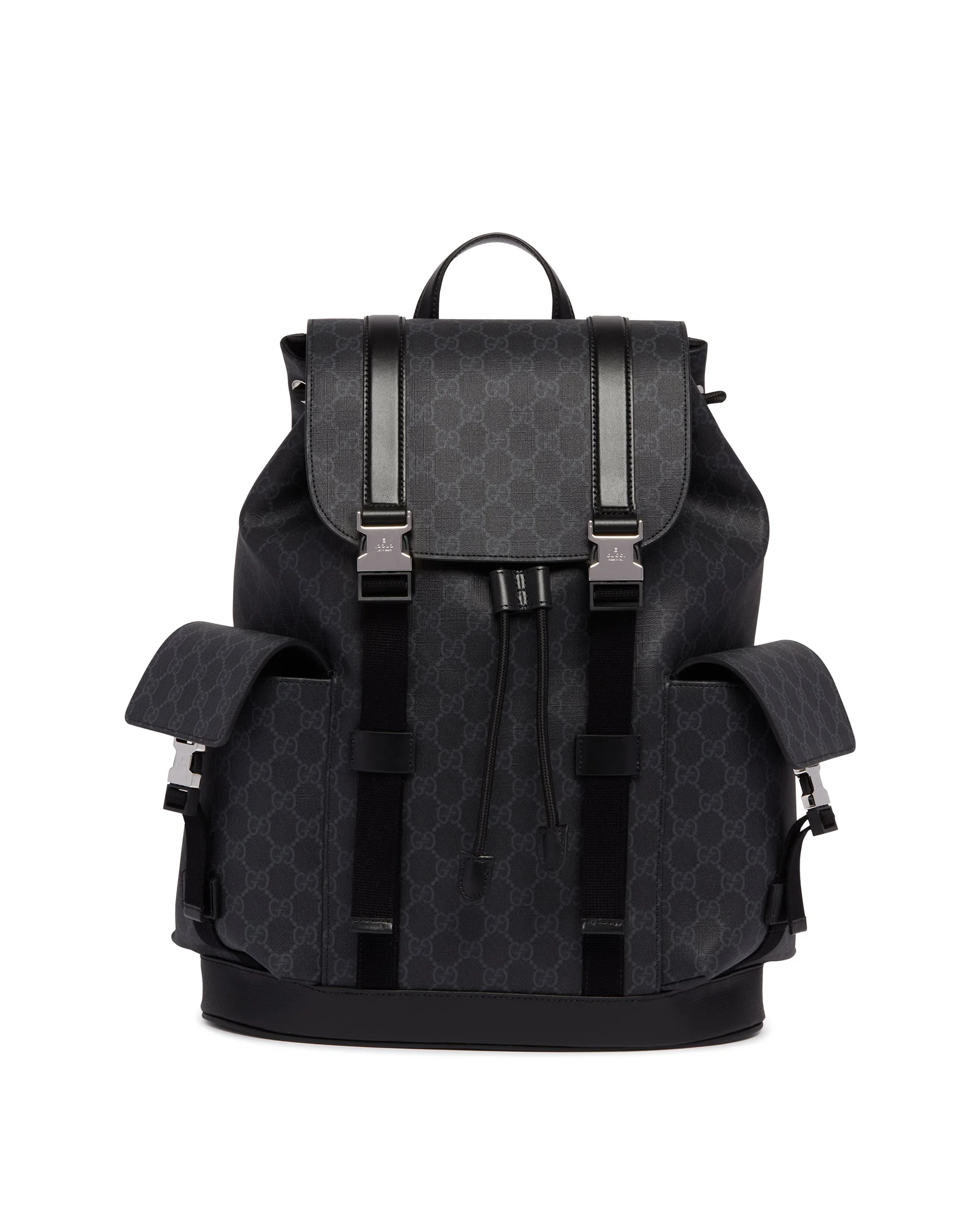 Gucci Black Large GG Backpack. Black GG Supreme fabric, tone-on-tone leather trim, blue-red Web stripe. Cottonlinen lining, padded mesh back, fabric shoulder straps, two side pockets with buckle closures. One padded laptop compartment, drawstring closure with flap. Size (cm): 46X35X12 DETAILS Model: 792080FADJQ1185 Composition: 100% Canvas Made in: ITALY Season: SS26