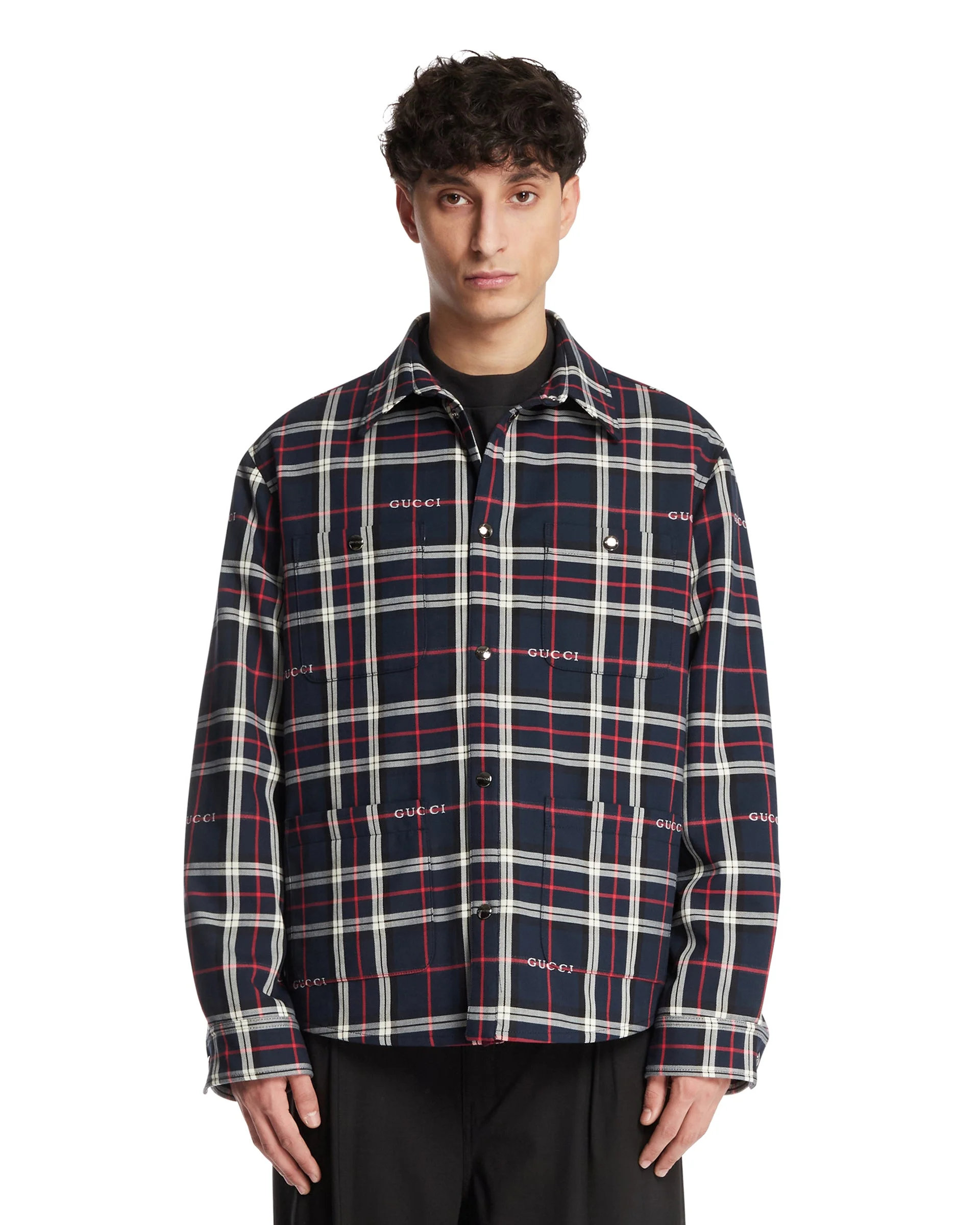 Gucci Quilted Jacquard Cotton Tartan Shirt. Multicolor Gucci jacquard cotton tartan, long sleeves, quilted lining, front button closure. Classic collar, patch pockets, regular fit. Giorgio is 190 cm and he is wearing size 50. DETAILS Model: 853013ZAUAC4069 Composition: 100% Cotton; Lining: 100% Polyamide Made in: ITALY Season: SS26