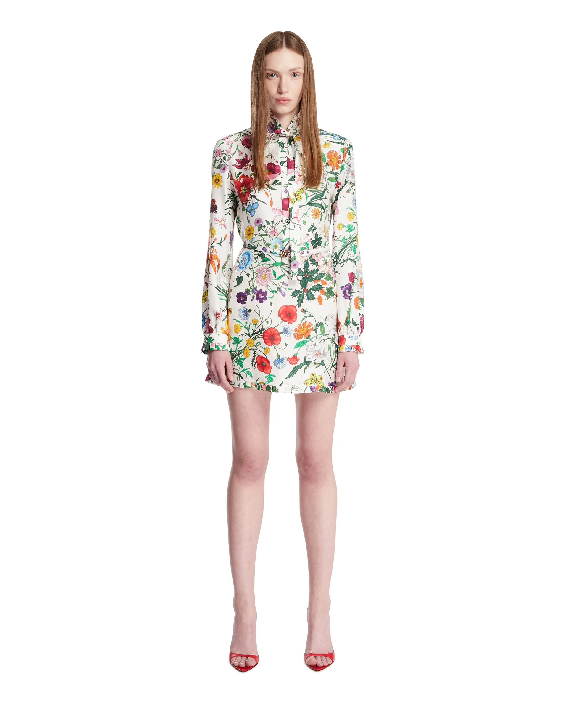 Gucci Silk Twill Printed Dress. Multicolor silk twill, all-over Gucci Flora print, ruffle trims, unlined, long sleeves, tie-neck bow. Detachable leather belt with Double G buckle, covered buttons. Yana is 178 cm and she is wearing size 40. DETAILS Model: 864362ZAUU89413 Composition: 100% Silk; Details: 100% Brass Made in: ITALY Season: SS26