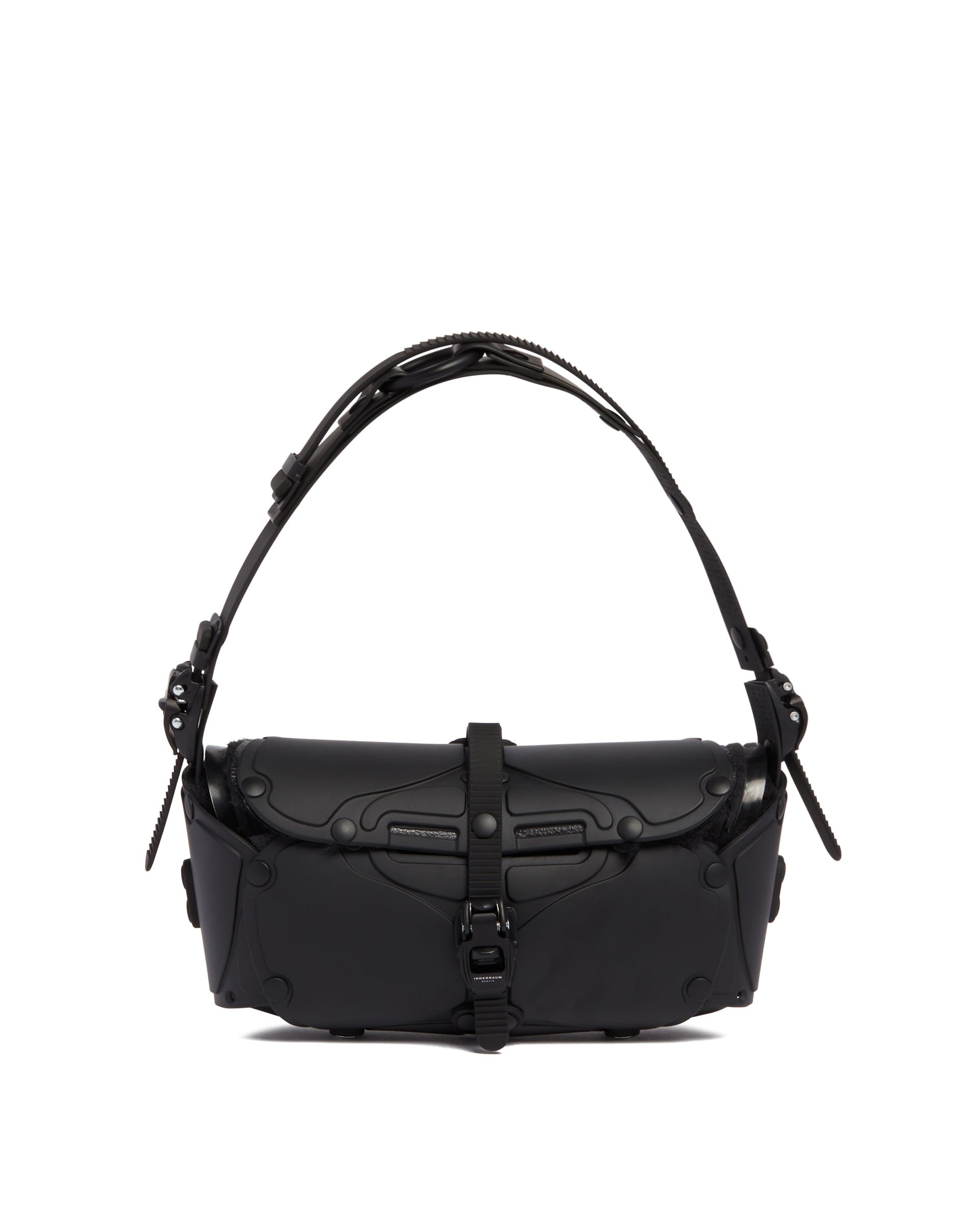 Innerraum Black Mini Stereo Bag. Black rigid rubber panels featuring rivets. Adjustable shoulder strap with zip and printed logo, flap with zip closure, lined with faux fur and equipped with protective metal feet. Size (cm): 25X15X10 DETAILS Model: I80BMBKPV00BLACKMATT Composition: 100% Rubber; Lining: 100% Polyester Made in: ITALY Season: FW24-25