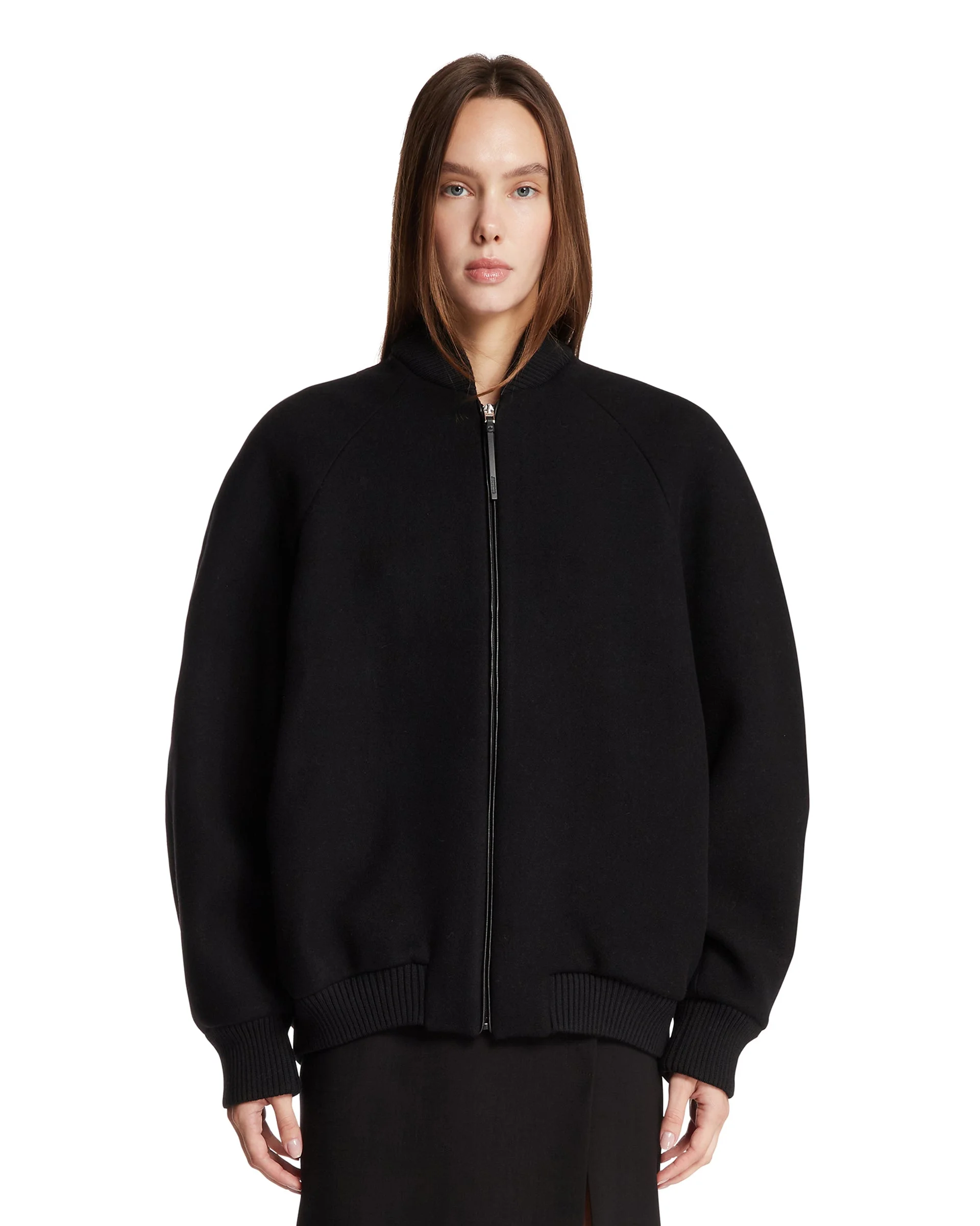 Jacquemus Black Wool Bomber Jacket. Black wool, long sleeves, front zip closure, tonal ribbed cuffs, collar and hem. Relaxed fit, viscose and cotton blend lining. Leather details. Daniele is 178 cm and she is wearing size 36. DETAILS Model: OUW00104AW00429990 Composition: 70% Alpaca Wool, 30% Virgin Wool; Lining: 52% Viscose, 48% Cotton; Details: 100% Leather Made in: PORTUGAL Season: FW25-26