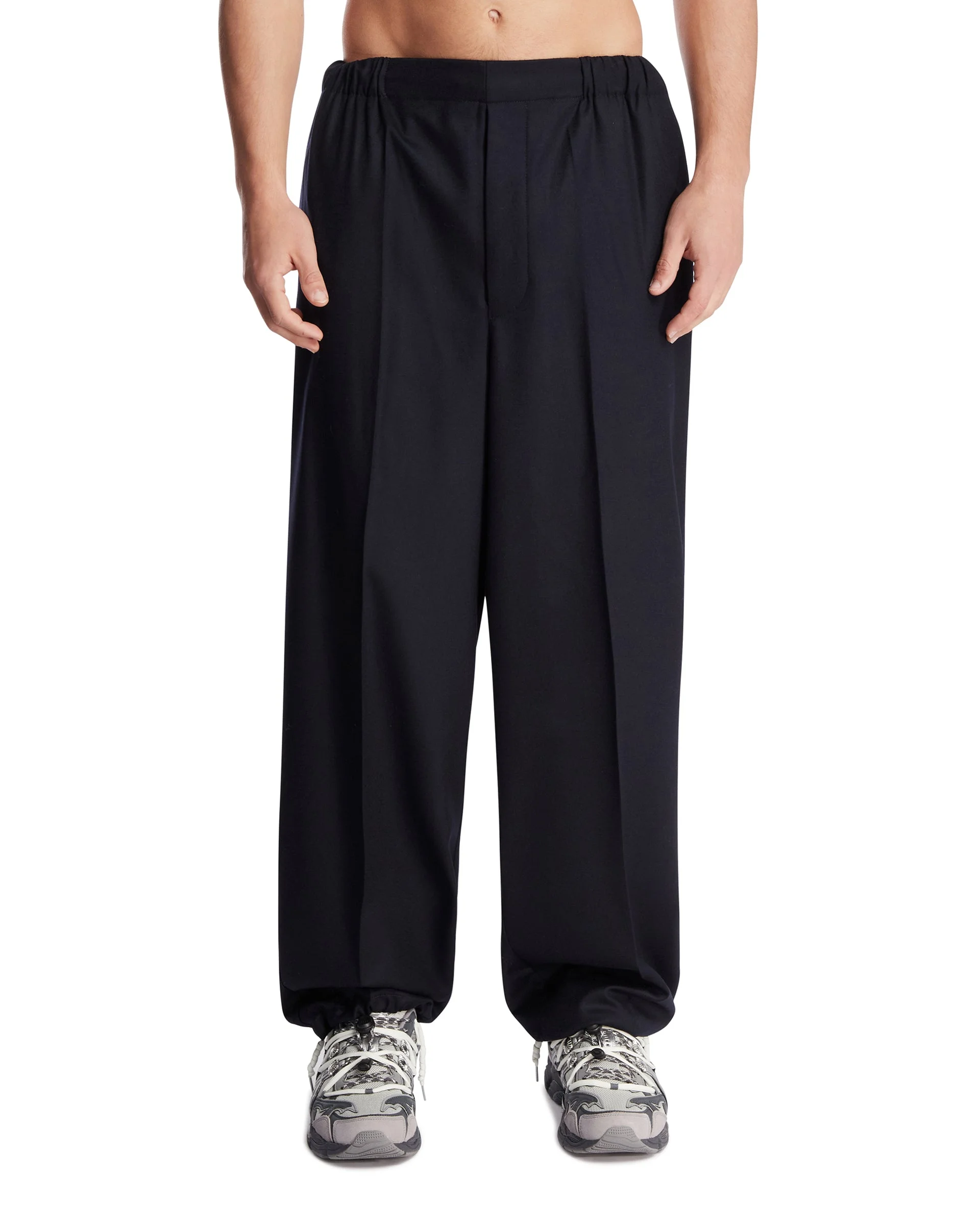 Jacquemus The Blue Gio Pants. Blue wool, elastic waistband on back panel. Three-horn buttoned fly, pressed pleats and wide straight leg. Elastic drawstring hem with stoppers and horn beads, back patch pockets. Unlined. Mitar is 186 cm and he is wearing size 48. DETAILS Model: PAM00530AW00631380 Composition: 100% Virgin Wool Made in: BULGARIA Season: FW25-26