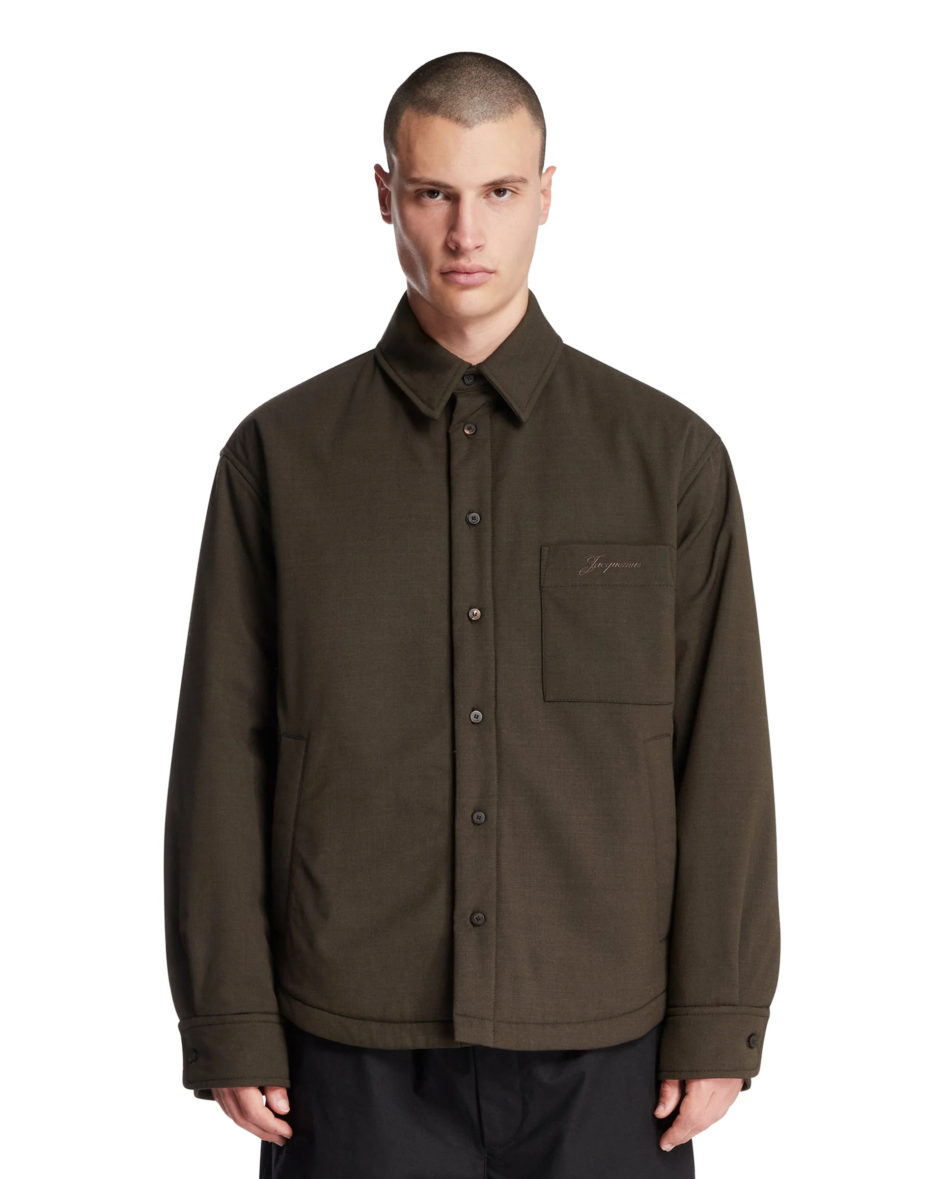 Jacquemus The Boulanger shirt. Green stretch virgin wool, pointed collar, chest patch pocket with embroidered logo. Interior patch pocket, front button placket and square cuffs, back yoke with J loop. Fully padded and lined, boxy fit. Mitar is 186 cm and he is wearing size 50. DETAILS Model: OUM00116AW00670580 Composition: 95% Virgin Wool, 5% Elastane; Lining: 55% Cotton, 45% Polyester Made in: Tunisia Season: FW25-26