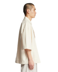 Jacquemus White Paysan Shirt. White cotton blend, pointed collar with button closure underneath. Three-quarter sleeves, chest patch pocket with stitching and embroidered J, J loop at the back, faux horn buttons. Relaxed fit. Minyung is 185 cm and he is wearing size 50. DETAILS Model: SHM00584AW00731110 Composition: 93% Cotton, 7% Polyamide Made in: PORTUGAL Season: SS26