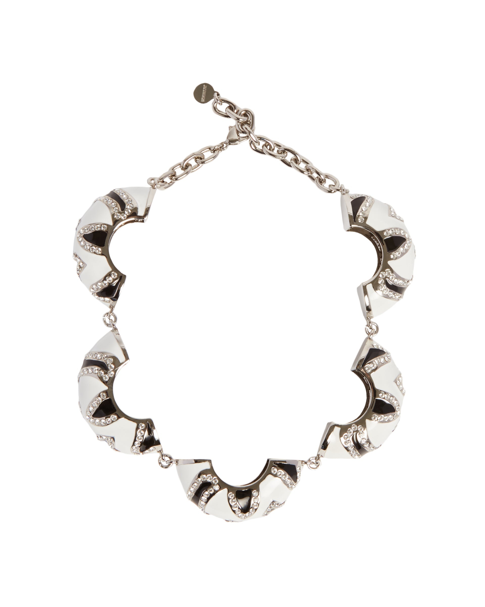 Jacquemus Zebra Necklace. Silver-tone brass, bi-color enamel detail with a zebra pattern effect and inlaid rhinestones. Engraved logo. DETAILS Model: 251JW72751009DZ Composition: 100% Brass; Details: 100% Glass Made in: ITALY Season: SS25