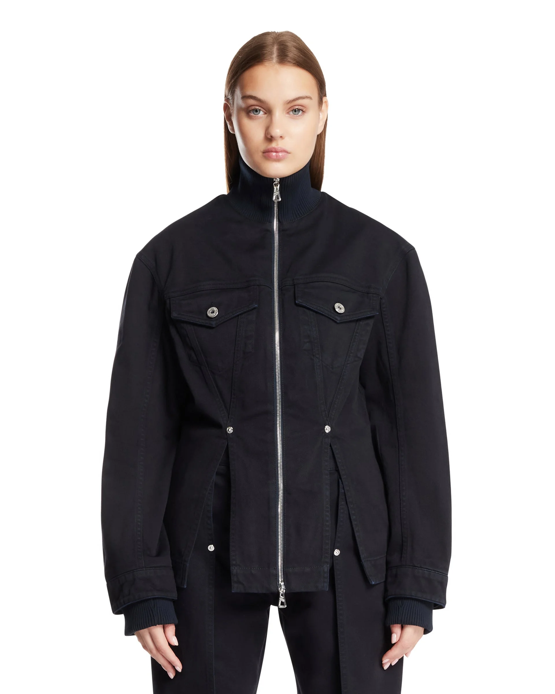 Jean Paul Gaultier Blue The Slit Denim Jacket. Blue cotton, ribbed collar and cuffs, two flap pockets at the front, long sleeves, two slits at the front. Zip closure with Jean Paul Gaultier engraving, logo buttons and rivets. Regular fit. Perla is 176 cm and she is wearing size S. DETAILS Model: WJA011W04959 Composition: 100% Cotton Made in: IITALY Season: FW25-26