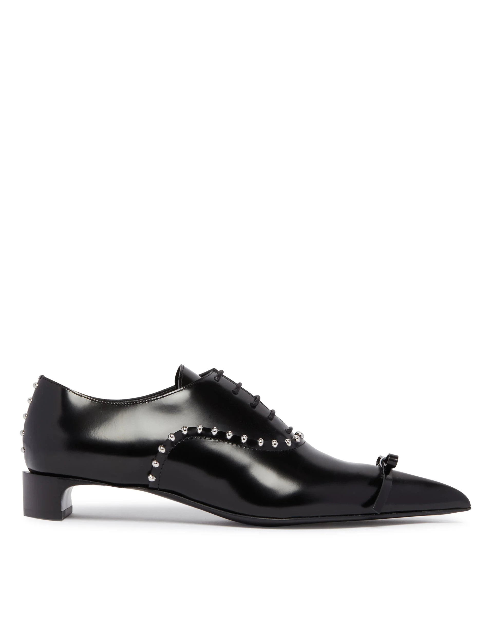 Jil Sander Black Pointed-toe leather lace-up pumps. Black leather upper, classic lace-up fastening, studs on upper and back and front bow. Calf leather outersole with rubber injection, logo branded on outersole and logo branded insole. DETAILS Model: J16ZJ0021P7032001 Composition: 100% Leather; Details: 100% Brass Made in: ITALY Season: FW25-26