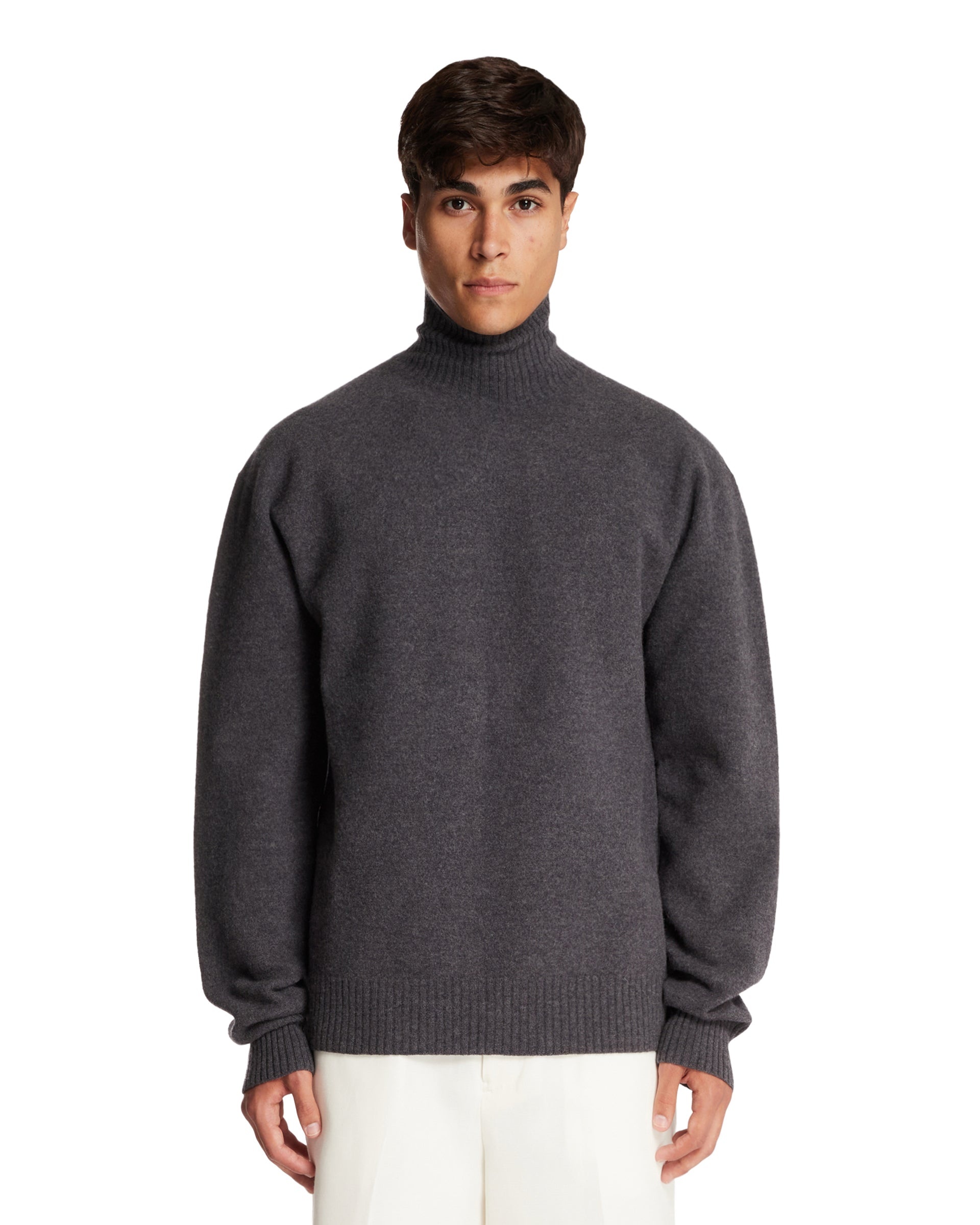 Jil Sander Gray Turtleneck Sweater. Gray wool, turtleneck, long sleeves, ribbed hem and cuffs, straight hem. Pedro is 185 cm and he is wearing size 50. DETAILS Model: J22GP0224J14603032 Composition: 100% Wool Made in: ITALY Season: FW25-26