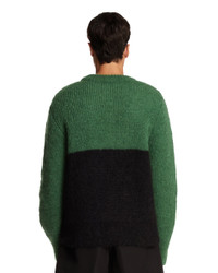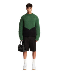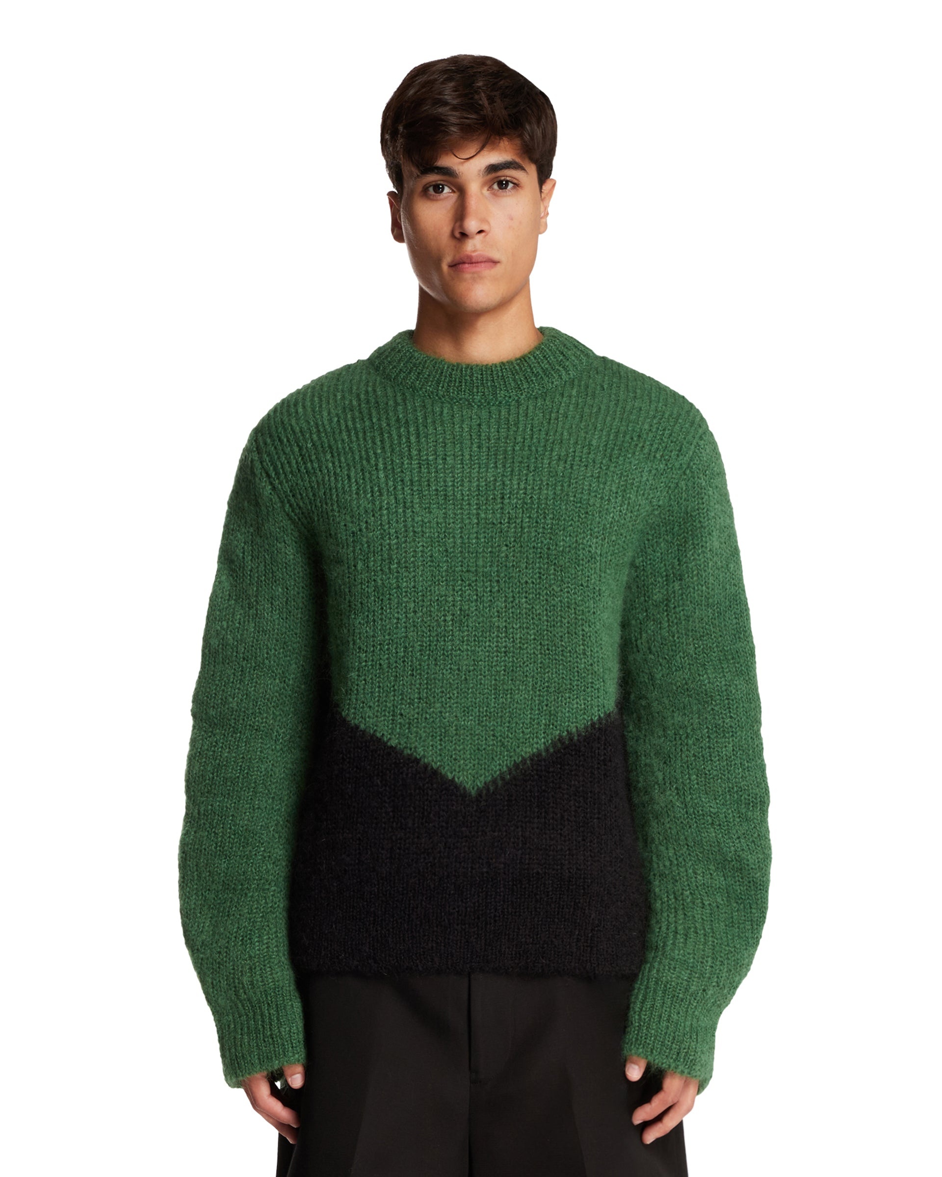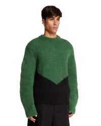 Jil Sander Green Wool Blend Crewneck Sweater. Green mohair blend with intarsia graphic pattern. Crewneck, long sleeves, oversized fit. Ribbed collar, hem and cuffs. Pedro is 185 cm and he is wearing size 48. DETAILS Model: J22GP0263J14779361 Composition: 78% Mohair, 22% Polyamide Made in: ITALY Season: FW25-26