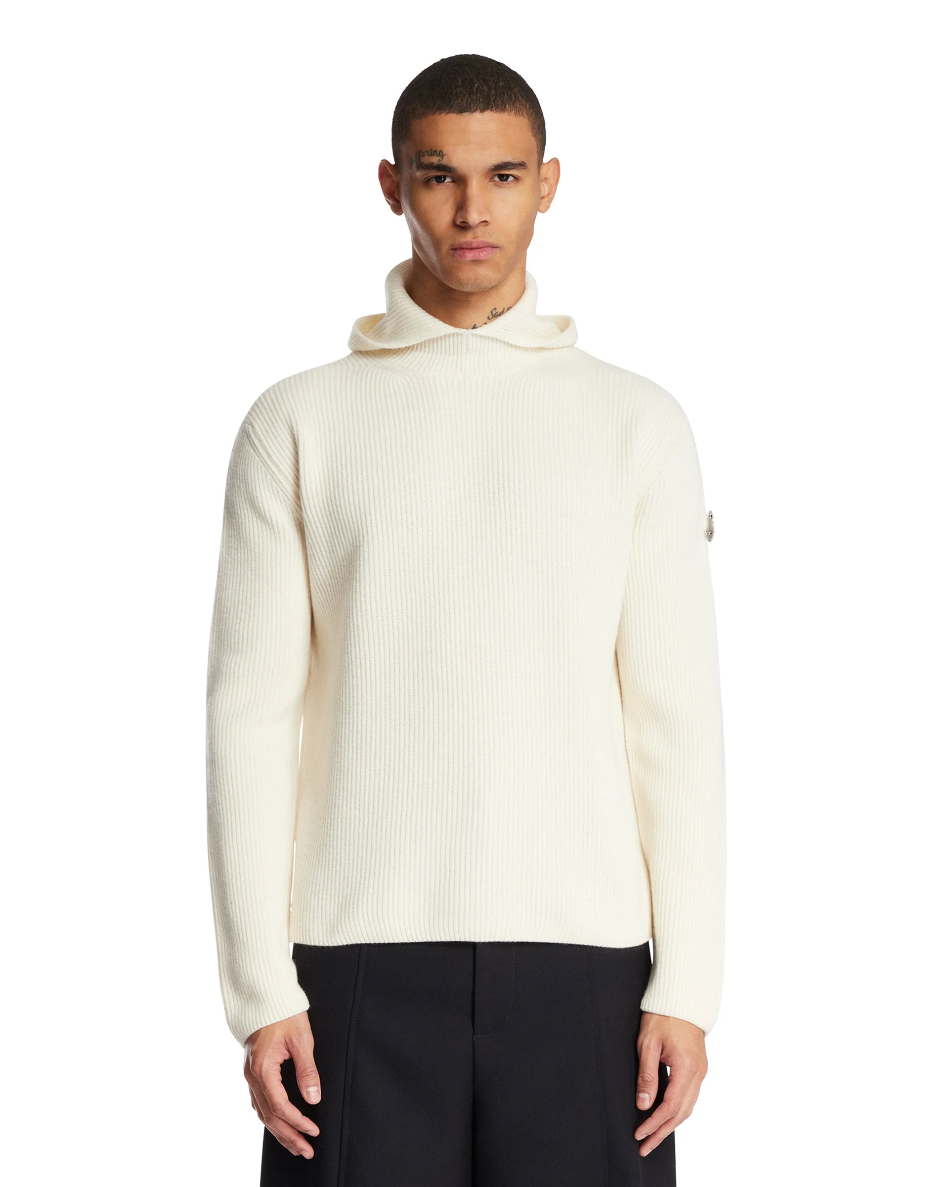 Moncler Genius x Jil Sander White Wool Sweater. White wool, ribbed knit, long sleeves, fixed hood, straight hem, regular fit. Detachable metal logo pin on the left sleeve. Paul is 187 cm and she is wearing size S. DETAILS Model: 9G00004M3328034 Composition: 100% Virgin Wool Made in: ITALY Season: FW25-26