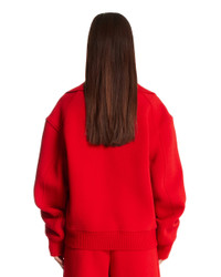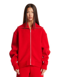 Jil Sander Red Structured Jacket. Red virgin wool blend, pointed collar, long sleeves, dropped shoulders, ribbed hem and cuffs, front zip closure, side pockets, straight hem, viscose lining. Isla is 176 cm and she is wearing size 36. DETAILS Model: J02BN0223J20318621 Composition: 67% Virgin Wool, 33% Polyamide; Lining: 100% Viscose Made in: ITALY Season: FW25-26