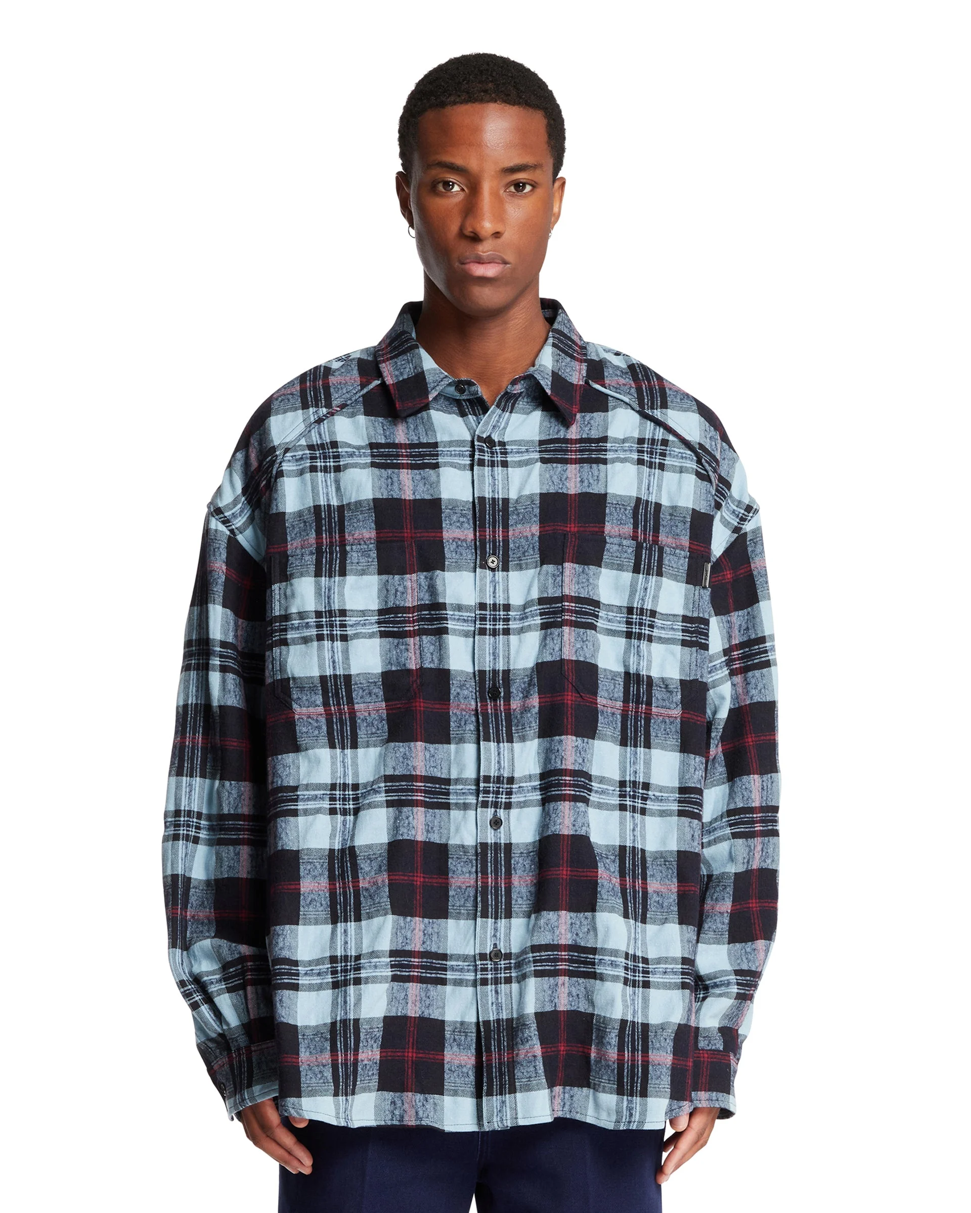 Juun.J Blue Cotton and Wool Shirt. Blue checkered cotton and wool, crinkled finish, classic collar, long sleeves, front button closure. Cuff buttons, chest pocket, rounded hem, relaxed fit. Ronaldo is 188 cm and he is wearing size 50. DETAILS Model: JC5864P08P Composition: 67% Cotton, 33% Wool Made in: KOREA Season: FW25-26