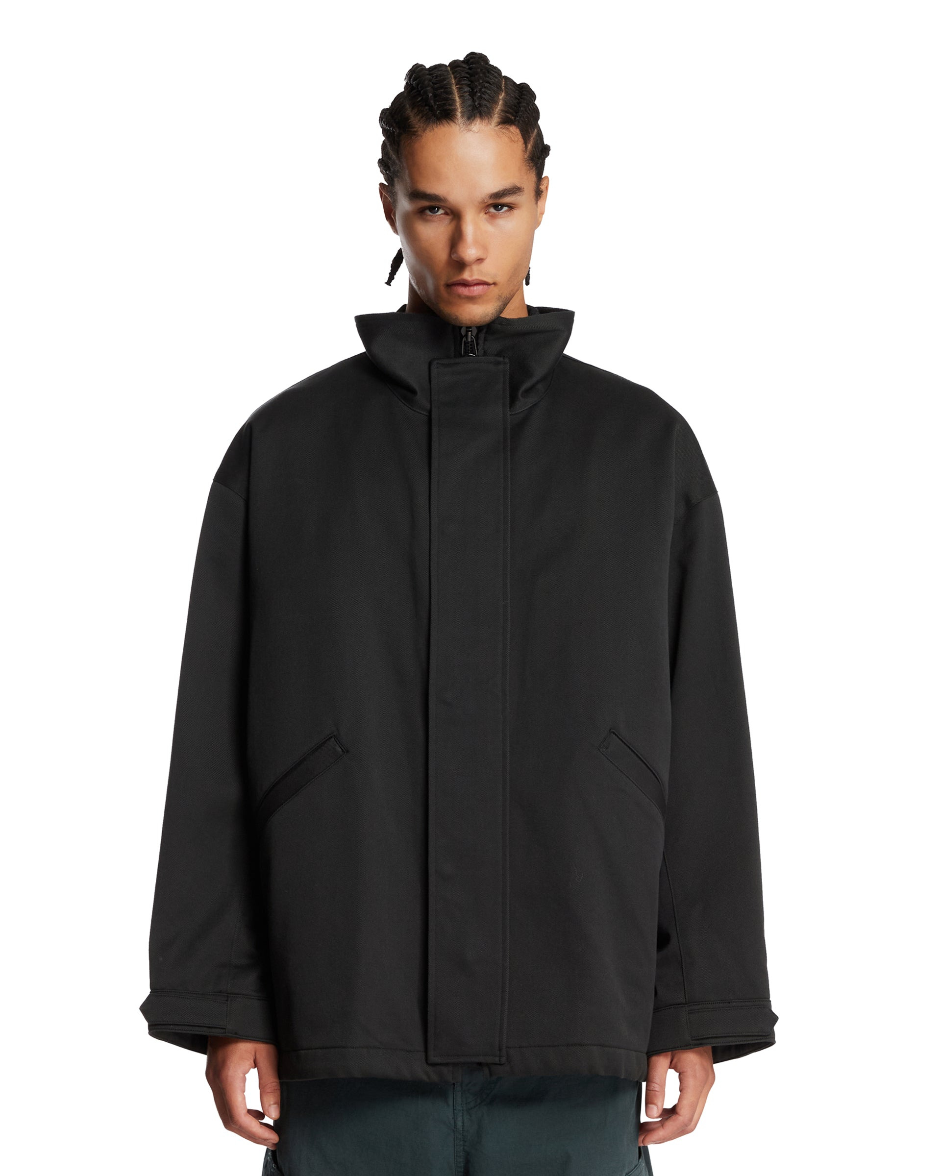 Kaptain Sunshine Black Cotton Mil Short Coat. Black cotton, high collar, concealed front zip closure, long sleeves with adjustable cuff straps, side pockets, dropped shoulders. Straight hem, tonal stitching, relaxed fit. Thiago is 185 cm and he is wearing size IV. DETAILS Model: KS25FJK24BLA Composition: 100% Cotton Made in: JAPAN Season: FW25-26