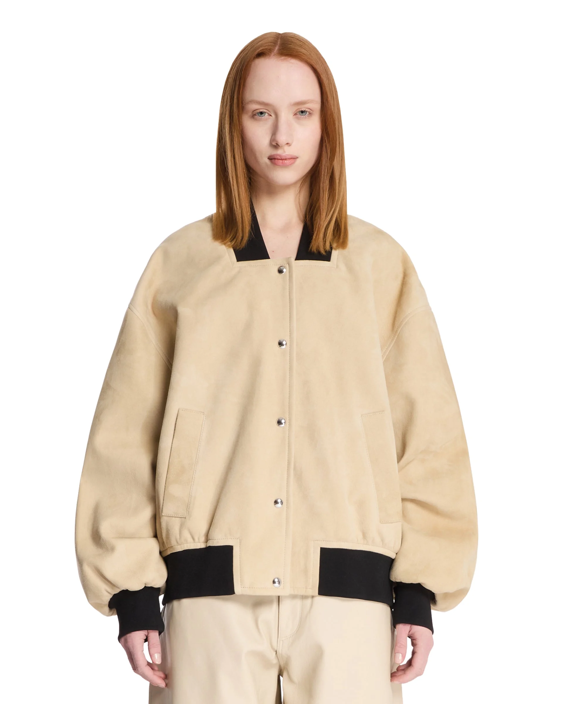 Khaite Beige Spence Jacket. Beige suede leather with contrast details, ribbed stand-up collar, long sleeves, elbow patches, ribbed hem and cuffs, front closure with snap buttons, two side pockets, straight hem, cupro lining. Liza is 176 cm and she is wearing size 4. DETAILS Model: 6165709912 Composition: 100% Leather; Lining: 100% Cupro Made in: ROMANIA Season: SS25